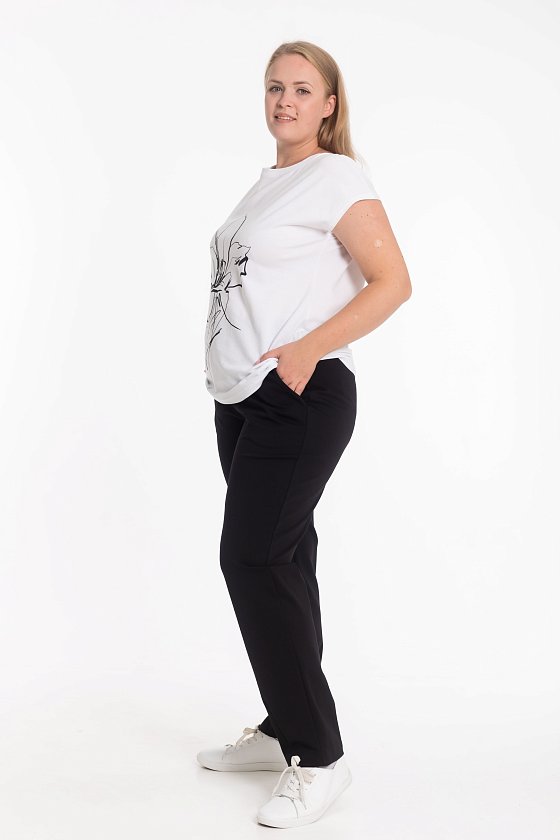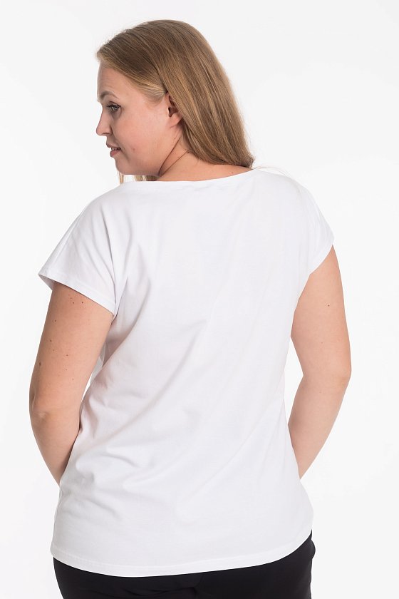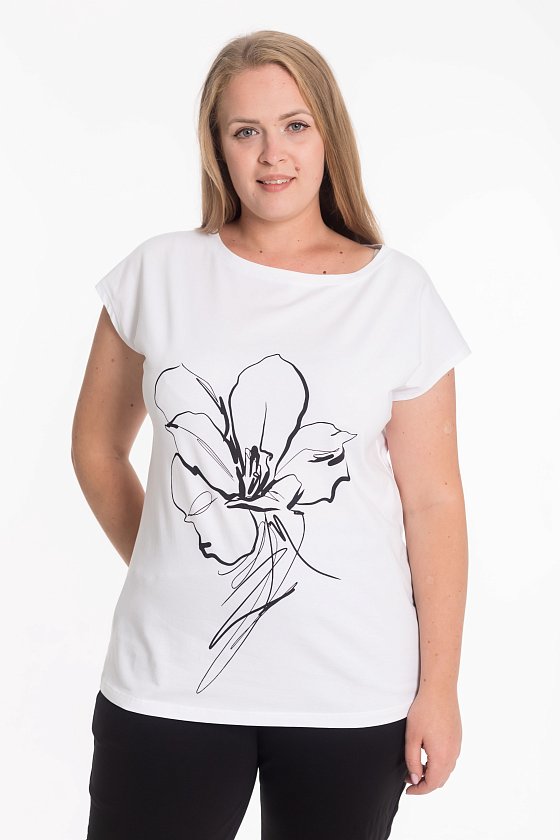 Футболка выполнена из хлопка с добавлением лайкры, что обеспечивает удобную посадку по фигуре и свободу движений. Футболка с модной линией плеча спущенного кроя и элегантной горловиной-лодочкой. Принт спереди дополняет образ, делая его современным и завершенным.