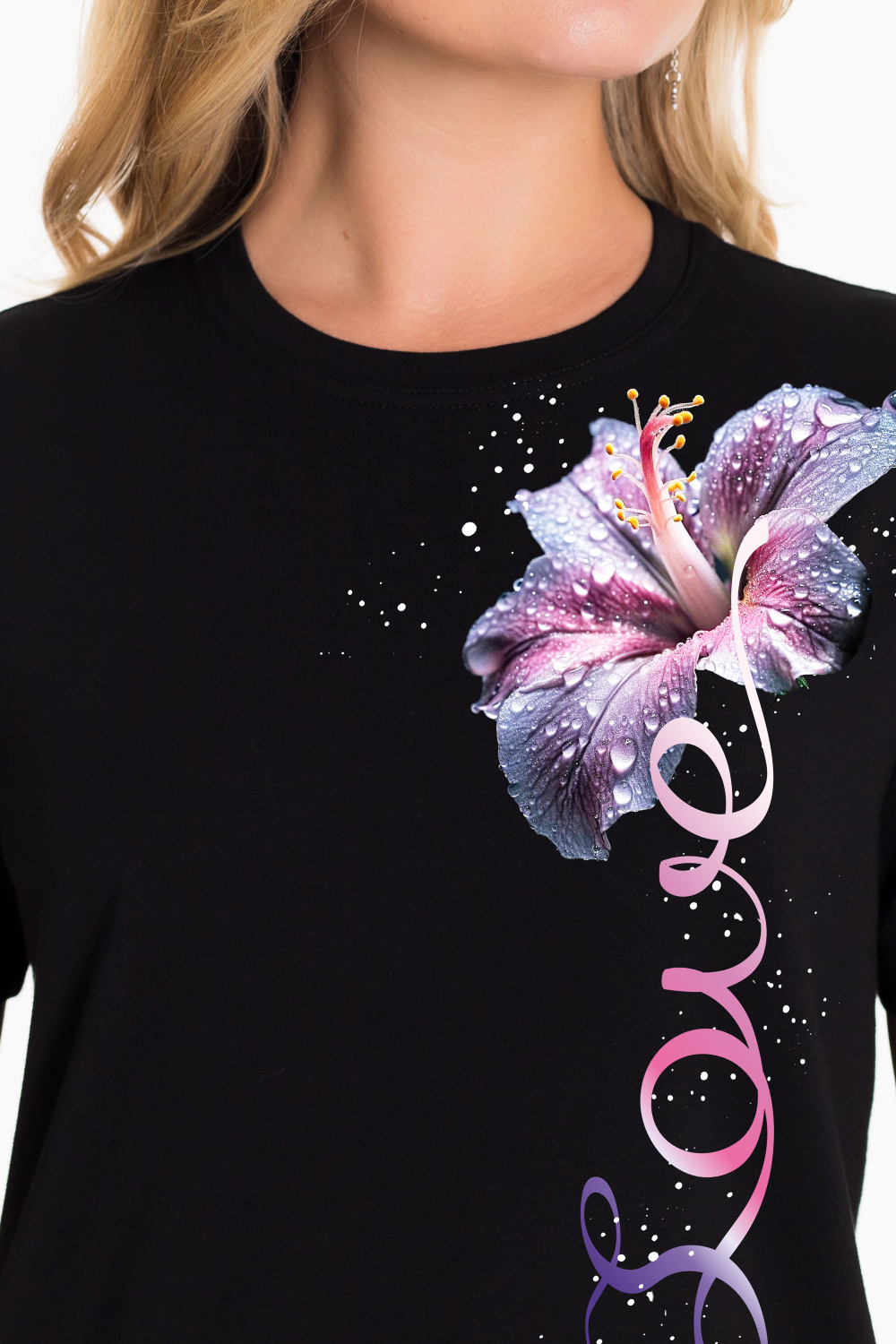 Женская футболка с принтом спереди изготовлена из хлопкового полотна с добавлением лайкры. Футболка с коротким втачным рукавом и круглым вырезом горловины, что придает ей классический стильный вид. Такая модель футболки отлично сочетается с джинсами, брюками или юбкой. Изготовленная из натуральной ткани, футболка обеспечит комфорт в течение всего дня. Хлопок 95% Лайкра 5%
