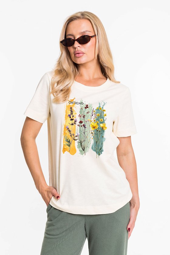 Женская футболка с принтом изготовлена из хлопкового полотна - кулирка "фламли", что обеспечивает комфорт и хорошую воздухопроницаемость. Футболка имеет короткий рукав и круглый вырез горловины, что придает ей классический стильный вид. Такая модель футболки отлично сочетается с джинсами, брюками или юбкой. Изготовленная из натуральной ткани, футболка обеспечит комфорт в течение всего дня.