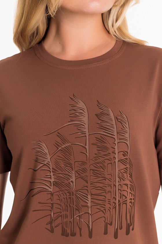 Женская футболка с принтом спереди изготовлена из хлопкового полотна с добавлением лайкры. Футболка с коротким втачным рукавом и круглым вырезом горловины, что придает ей классический стильный вид. Такая модель футболки отлично сочетается с джинсами, брюками или юбкой. Изготовленная из натуральной ткани, футболка обеспечит комфорт в течение всего дня.