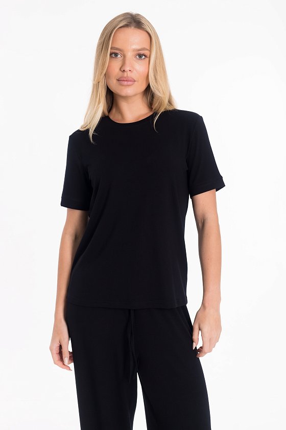Футболка женская выполнена из вискозы чёрного цвета. Классический крой с втачным рукавом и круглым вырезом горловины делает модель универсальной и удобной для повседневной носки. Лаконичный дизайн позволяет легко сочетать футболку с другими элементами гардероба.
