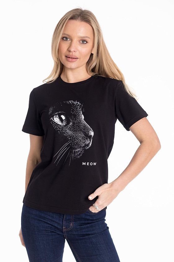 Женская футболка с принтом изготовлена из хлопкового полотна c добавлением лайкры, что обеспечивает комфорт и хорошую воздухопроницаемость. Футболка имеет короткий втачной рукав и круглый вырез горловины, что придает ей классический стильный вид. Такая модель базового черного цвета отлично сочетается с джинсами, брюками или юбкой. Изготовленная из натуральной ткани, футболка обеспечит комфорт в течение всего дня.