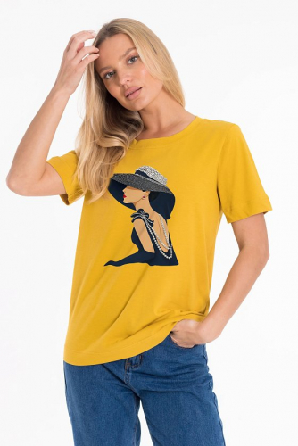 Женская футболка с принтом изготовлена из хлопкового полотна c добавлением лайкры, что обеспечивает комфорт и хорошую воздухопроницаемость. Футболка имеет короткий втачной рукав и круглый вырез горловины, что придает ей классический стильный вид. Такая модель базового черного цвета отлично сочетается с джинсами, брюками или юбкой. Изготовленная из натуральной ткани, футболка обеспечит комфорт в течение всего дня.