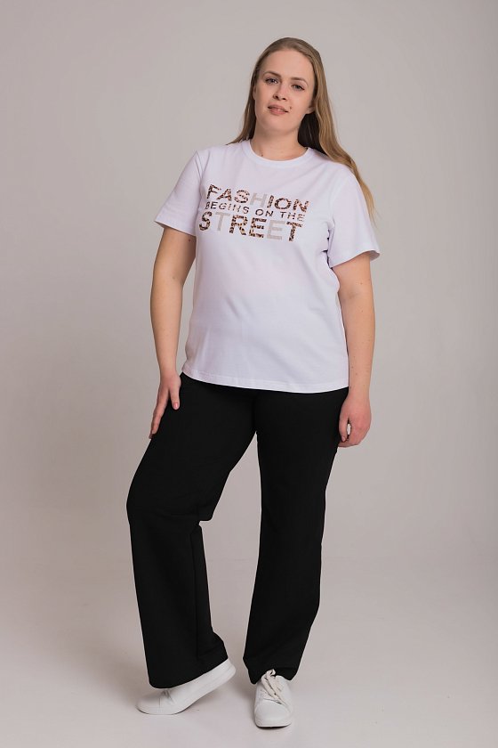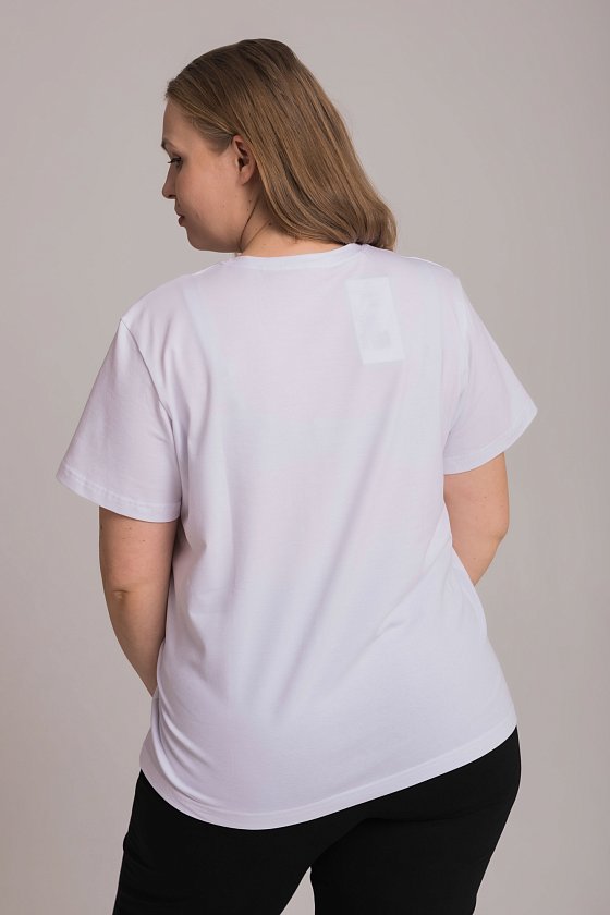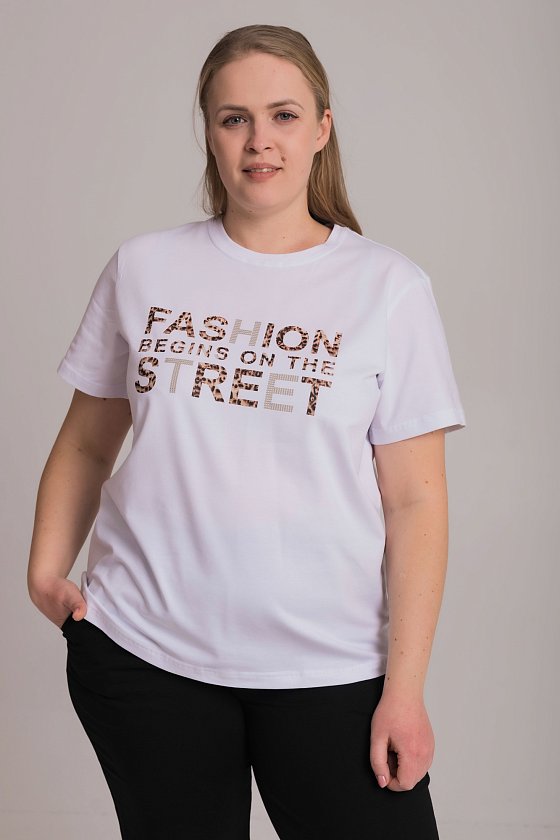 Женская футболка с принтом спереди изготовлена из хлопкового полотна с добавлением лайкры. Футболка с коротким втачным рукавом и круглым вырезом горловины, что придает ей классический стильный вид. Такая модель футболки отлично сочетается с джинсами, брюками или юбкой. Изготовленная из натуральной ткани, футболка обеспечит комфорт в течение всего дня.