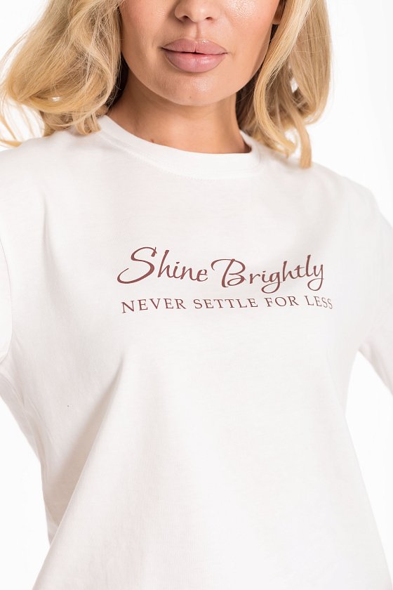 Женская футболка изготовлена из хлопкового полотна, что обеспечивает комфорт и отличную воздухопроницаемость. Модель выполнена в базовом молочном цвете, имеет короткий рукав и круглый вырез горловины, создавая лаконичный и стильный образ. Спереди украшена аккуратным принтом, добавляющим индивидуальности. Благодаря натуральной ткани футболка приятна к телу и подходит для носки в течение всего дня, легко сочетаясь с джинсами, брюками или юбкой.