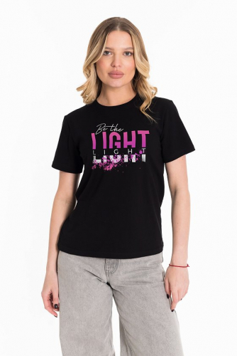 Женская футболка изготовлена из хлопкового полотна с добавлением лайкры, что обеспечивает комфорт и хорошую воздухопроницаемость. Футболка имеет короткий втачной рукав и круглый вырез горловины, что придает ей классический стильный вид. Такая модель базового черного цвета отлично сочетается с джинсами, брюками или юбкой. Изготовленная из натуральной ткани, футболка обеспечит комфорт в течение всего дня.
