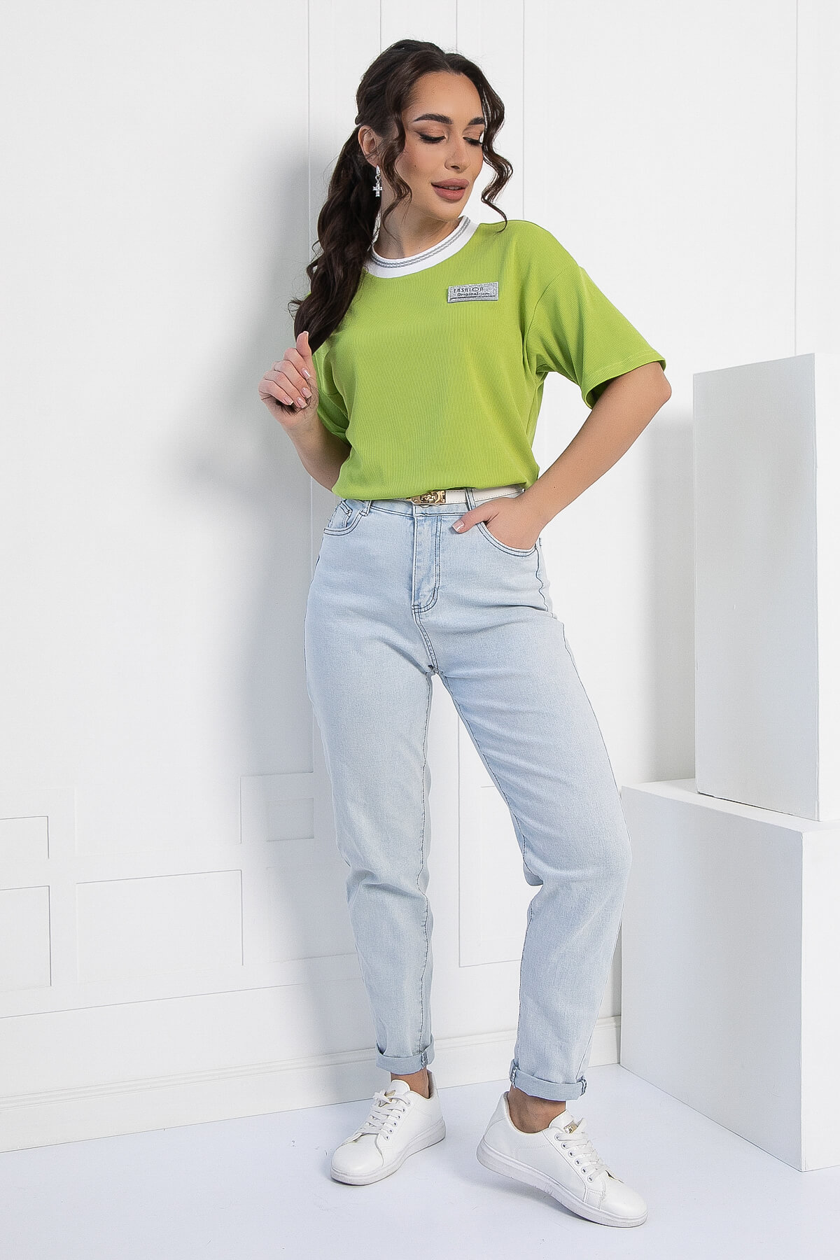Футболка из трикотажа "Лапша" идеальный вариант на каждый день! Изделие украшает нашивка спереди на груди. Рукав укороченный, со спущенным плечевым швом. Идеально смотрится с джинсами и с брюками. Акцентный воротник придает особый шарм!