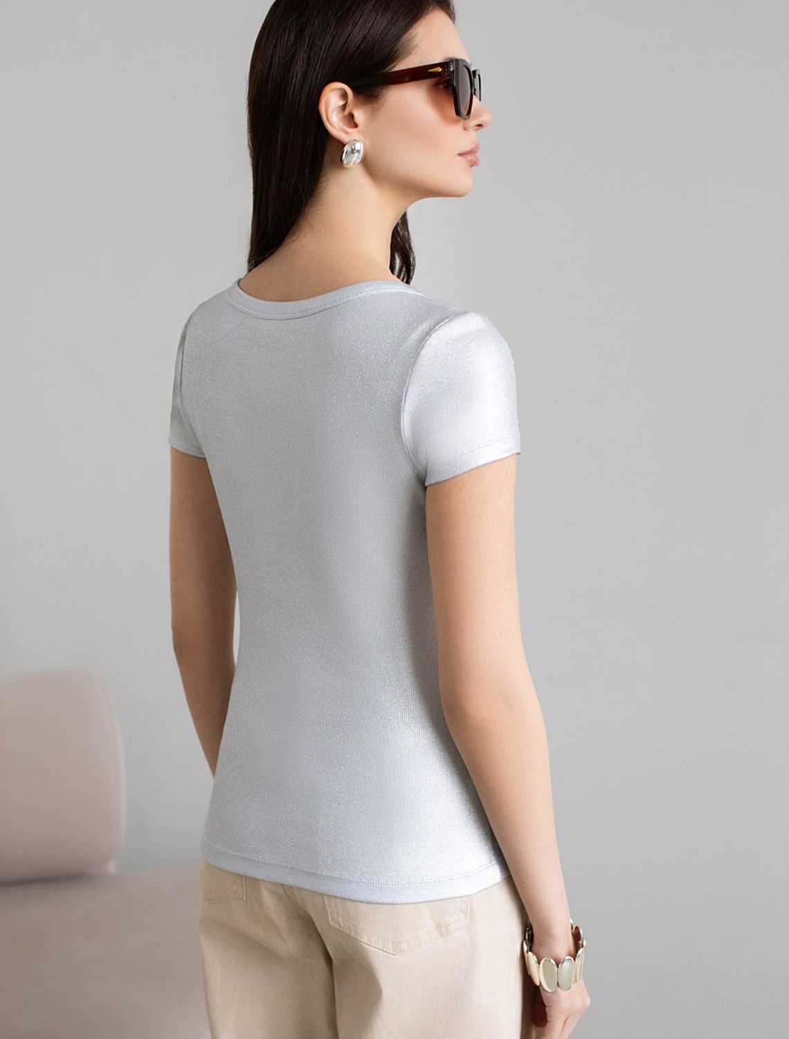 Повседневная футболка универсальна: она сочетается с джинсами, юбками или строгими брюками — легко создать как деловой образ для офиса, так и наряд для вечеринки или ужина вне дома. Матовое покрытие создает благородный блеск без лишней яркости, благодаря чему футболка смотрится свежо и актуально.