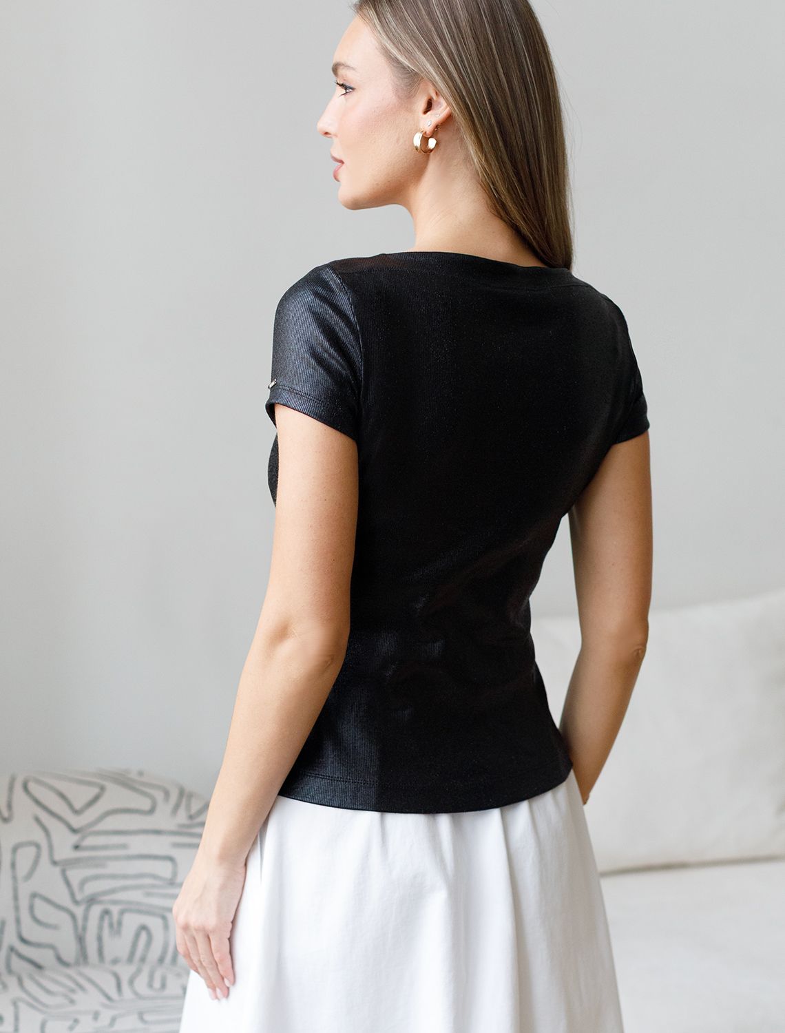 Футболка облегающая из хлопка в рубчик с вырезом лодочка с матовым покрытием металлик D49.093 черный