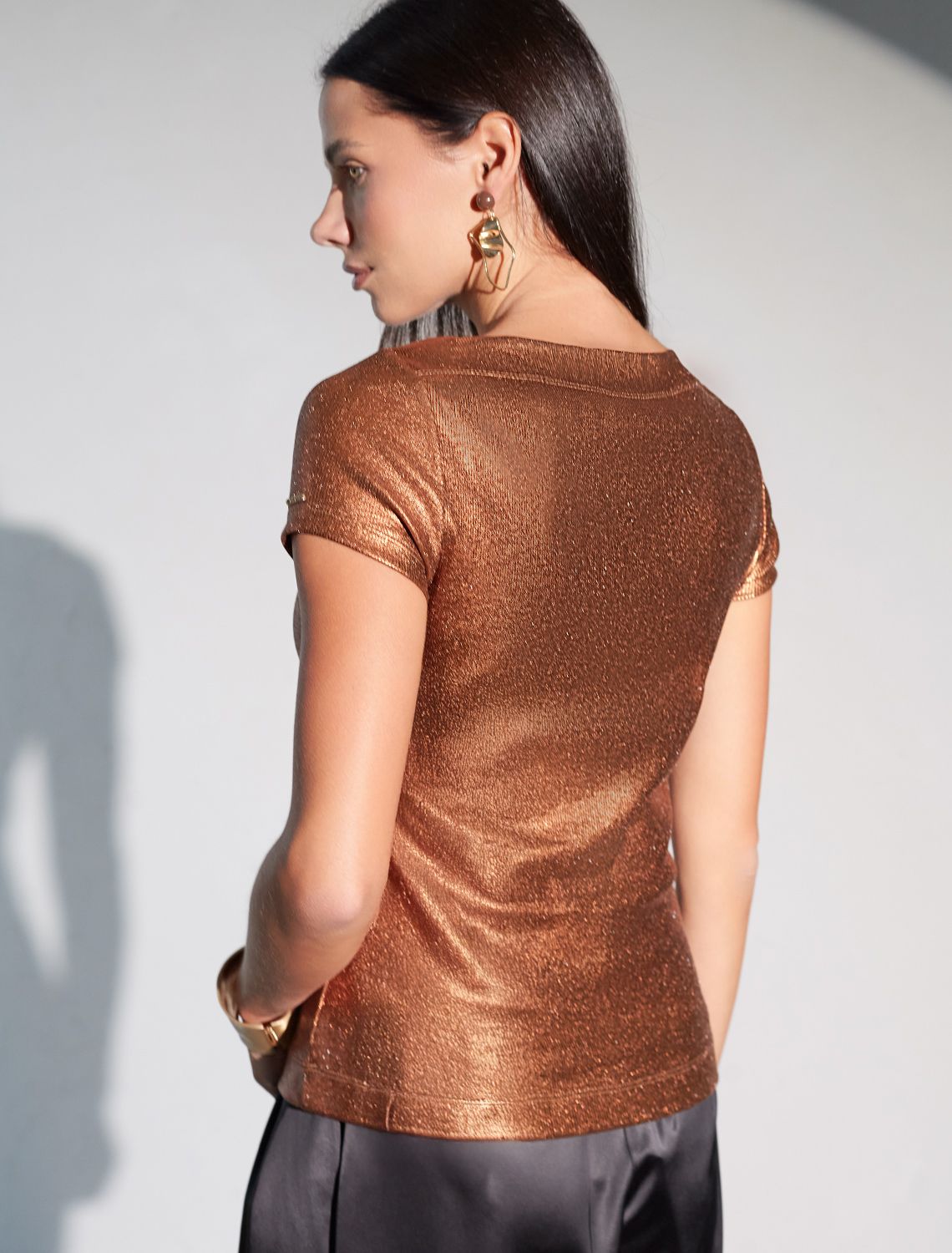 Повседневная футболка универсальна: она сочетается с джинсами, юбками или строгими брюками — легко создать как деловой образ для офиса, так и наряд для вечеринки или ужина вне дома. Матовое покрытие создает благородный блеск без лишней яркости, благодаря чему футболка смотрится свежо и актуально.