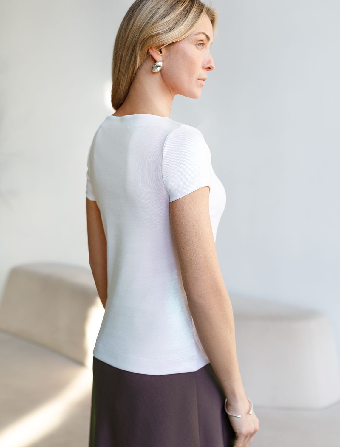 Повседневная футболка универсальна: она сочетается с джинсами, юбками или строгими брюками — легко создать как деловой образ для офиса, так и наряд для вечеринки или ужина вне дома. Матовое покрытие создает благородный блеск без лишней яркости, благодаря чему футболка смотрится свежо и актуально.