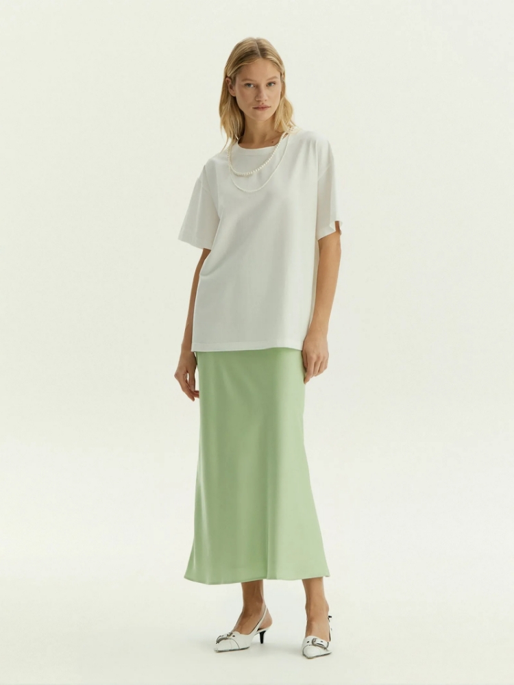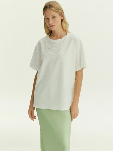 Футболка в стиле кэжуал-шик отлично впишется в планы на будни и выходные. Съёмные жемчужные нити крепятся на удобном карабине. Их можно снять — остаётся лаконичная футболка с двумя аккуратными люверсами сзади. Модель имеет свободный короткий спущенный рукав, что делает её чуть более расслабленной. Комфортный материал из хлопка меньше мнётся за счёт добавления эластана. Эта удобная и необычная вещь незаменима в капсулах на любой сезон