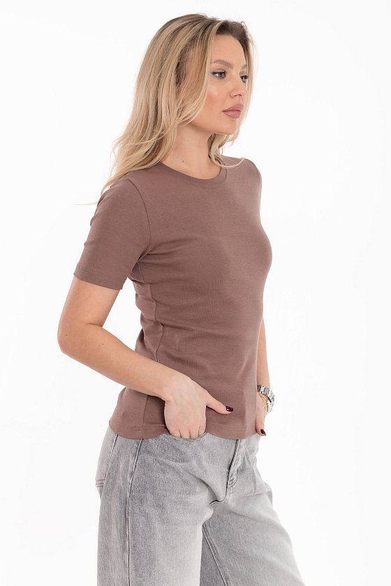Женская футболка выполнена из однотонной рибаны. Модель прилегающего силуэта с круглым вырезом горловины подчёркивает фигуру, а короткий втачной рукав делает образ лаконичным и универсальным. Футболка отлично подойдёт для повседневной носки и легко сочетается с различными элементами гардероба.