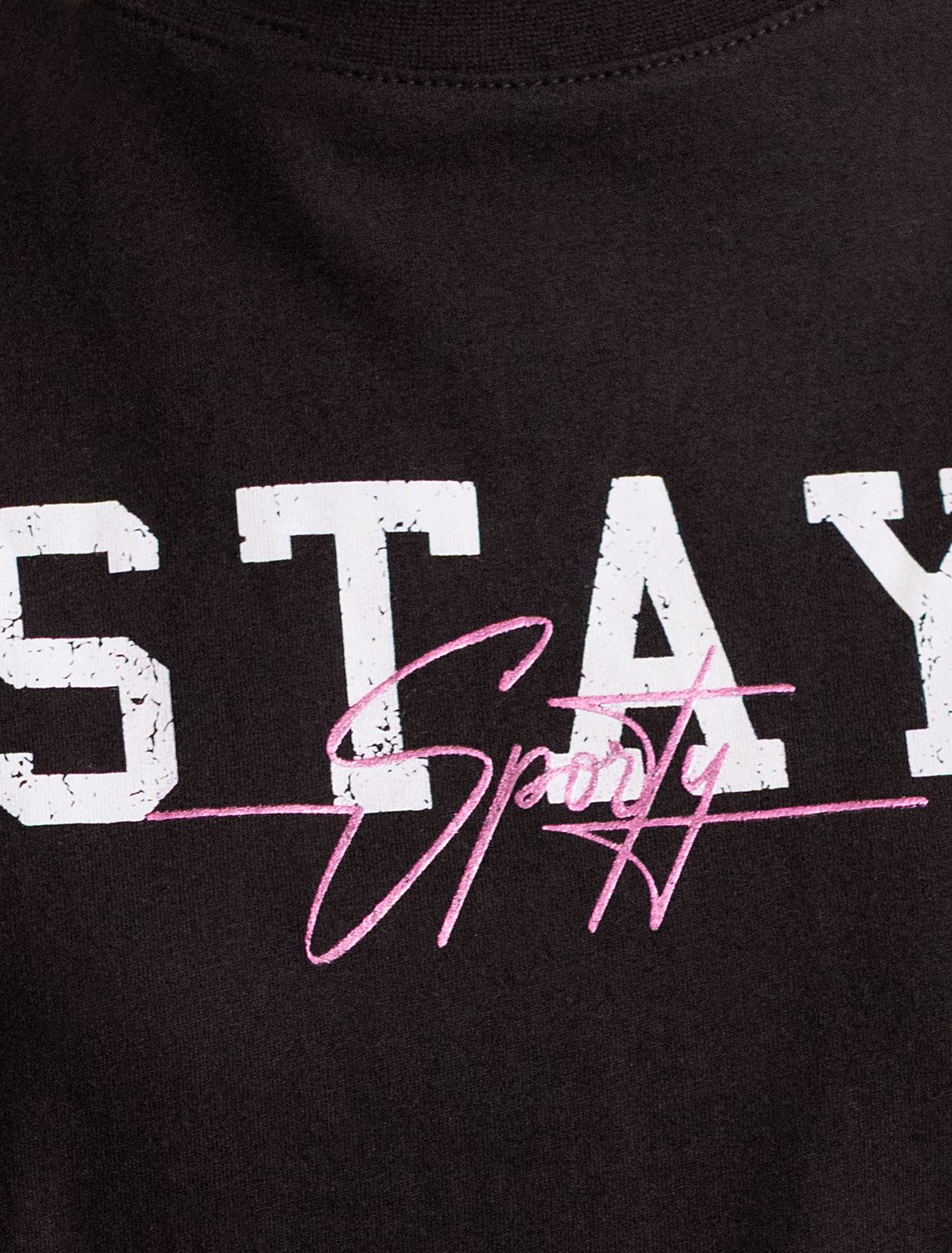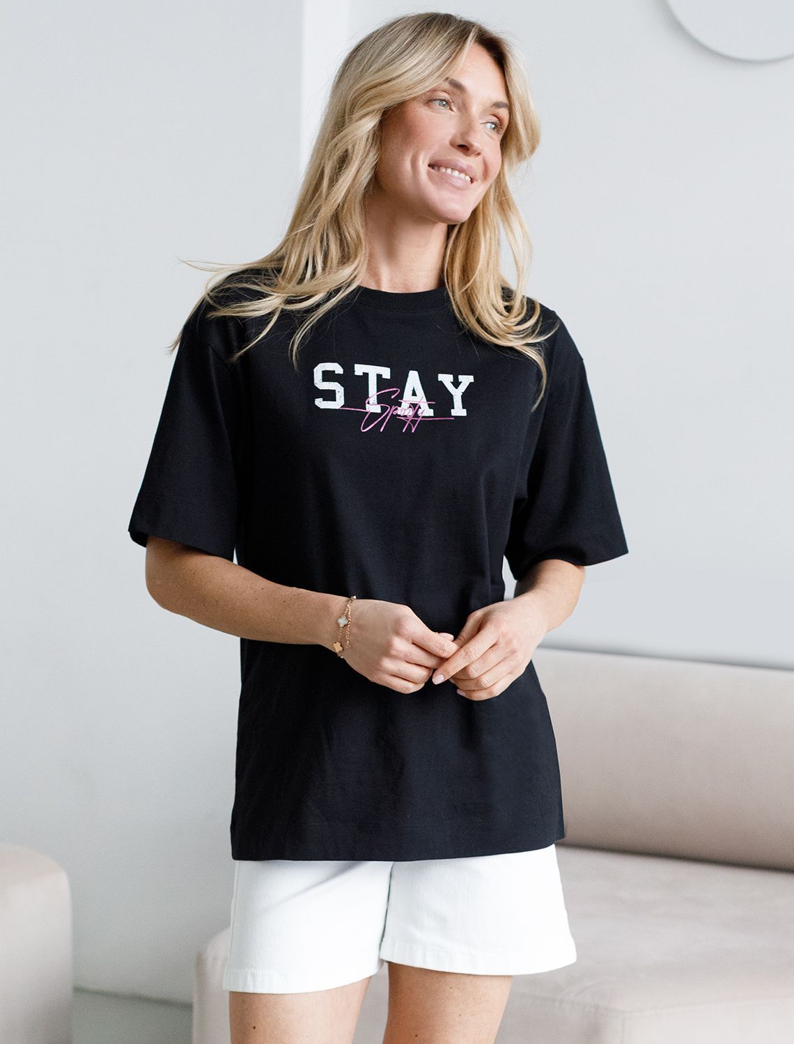 Оверсайз футболка черного цвета изготовлена из премиального 100% хлопка, она обеспечивает невероятное ощущение уюта и легкости. Натуральный материал сохраняет форму и цвет после множества стирок, обеспечивая долговечность изделия, а его высокая воздухопроницаемость создает ощущение свежести даже в течение долгого дня. Особое внимание привлекает стильный принт в виде надписи. Перевод надписи: Stay Sporty - Оставайся спортивной. Принт выполнен красками с устойчивым покрытием, который добавляет футболке оригинальности и позволяет выразить индивидуальность. Свободный крой футболки дарит удобство и не стесняет движений, что делает ее идеальной для повседневной носки или активного отдыха, подчеркивает современный взгляд на моду. Подойдет девушкам и женщинам на любую фигуру, вы будете чувствовать себя в ней уверенно и комфортно. Отлично впишется в гардероб благодаря универсальному дизайну, который легко сочетать с любыми низами.