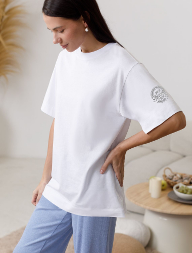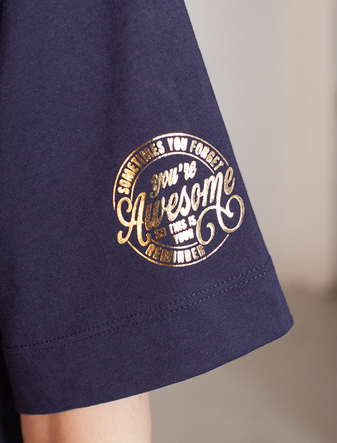 Оверсайз футболка темно-синего цвета выполнена из премиального 100% хлопка плотностью 140 Г/м2. Главная особенность этого изделия — тонкое кулирное полотно, которое легче и воздушнее стандартного варианта. Благодаря своей деликатной текстуре футболка идеально подходит для домашних образов и пижамных комплектов. Ткань отлично дышит, обеспечивая максимальный уют во время сна и отдыха. Особое внимание привлекает стильный принт в виде надписи на рукаве. Перевод надписи: Sometimes you forget Reminder You re Awesome So tnis is your - Иногда ты забываешь, как ты крута, так что это твое напоминание. Принт выполнен красками с устойчивым покрытием, который добавляет футболке оригинальности и позволяет выразить индивидуальность. Свободный крой футболки дарит удобство и не стесняет движений, что делает ее идеальной для повседневной носки или активного отдыха, подчеркивает современный взгляд на моду. Подойдет девушкам и женщинам на любую фигуру, вы будете чувствовать себя в ней уверенно и комфортно. Отлично впишется в гардероб благодаря универсальному дизайну, который легко сочетать с любыми низами.
