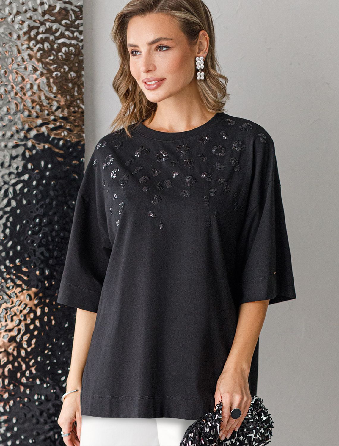Такая эффектная длинная футболка станет универсальным дополнением гардероба, позволяя создавать разнообразные образы с акцентом на современный стиль и утонченность деталей. Благодаря стильному дизайну с боковыми разрезами эта футболка станет идеальным вариантом для создания легких и непринужденных луков. черный_пайетки