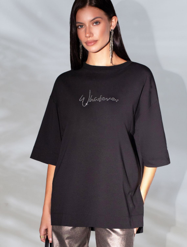 Оверсайз футболка черного цвета из премиального хлопка с добавлением эластана создана для комфорта и стиля каждый день. Натуральный материал приятный к телу, дышащая ткань хорошо держит форму и подходит для повседневной носки дома, в офисе или на прогулке. Классический свободный крой, удлиненный прямой силуэт и свободная посадка делают эту базовую футболку универсальным решением для любой фигуры и роста, включая плюс сайз размеры и беременных девушек, отлично скроет животик. Широкие рукава держат форму и подойдут на полные руки. Нарядная футболка украшена авторским принтом пайетками. Такой акцент делает модель уместной как для особых случаев, так и для ежедневных образов.