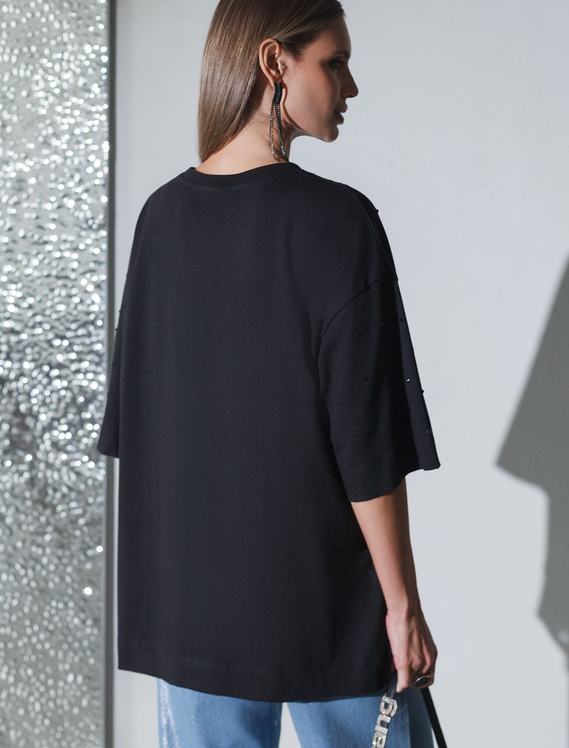Оверсайз футболка черного цвета из премиального хлопка с добавлением эластана создана для комфорта и стиля каждый день. Натуральный материал приятный к телу, дышащая ткань хорошо держит форму и подходит для повседневной носки дома, в офисе или на прогулке. Классический свободный крой, удлиненный прямой силуэт и свободная посадка делают эту базовую футболку универсальным решением для любой фигуры и роста, включая плюс сайз размеры и беременных девушек, отлично скроет животик. Широкие рукава держат форму и подойдут на полные руки. Нарядная футболка украшена авторским принтом в виде россыпи страз в тон основного полотна, которые создают красивый мерцающий эффект. Такой акцент делает модель уместной как для особых случаев, так и для ежедневных образов.