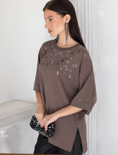 Оверсайз футболка кофейного цвета из премиального хлопка с добавлением эластана создана для комфорта и стиля каждый день. Натуральный материал приятный к телу, дышащая ткань хорошо держит форму и подходит для повседневной носки дома, в офисе или на прогулке. Классический свободный крой, удлиненный прямой силуэт и свободная посадка делают эту базовую футболку универсальным решением для любой фигуры и роста, включая плюс сайз размеры и беременных девушек, отлично скроет животик. Широкие рукава держвт форму и подойдут на полные руки. Нарядная футболка украшена авторским принтом в виде россыпи страз в тон основного полотна, которые создают красивый мерцающий эффект. Такой акцент делает модель уместной как для особых случаев, так и для ежедневных образов.