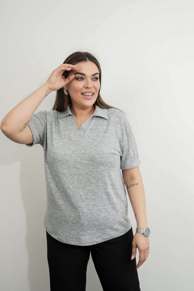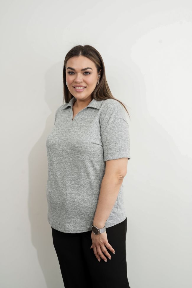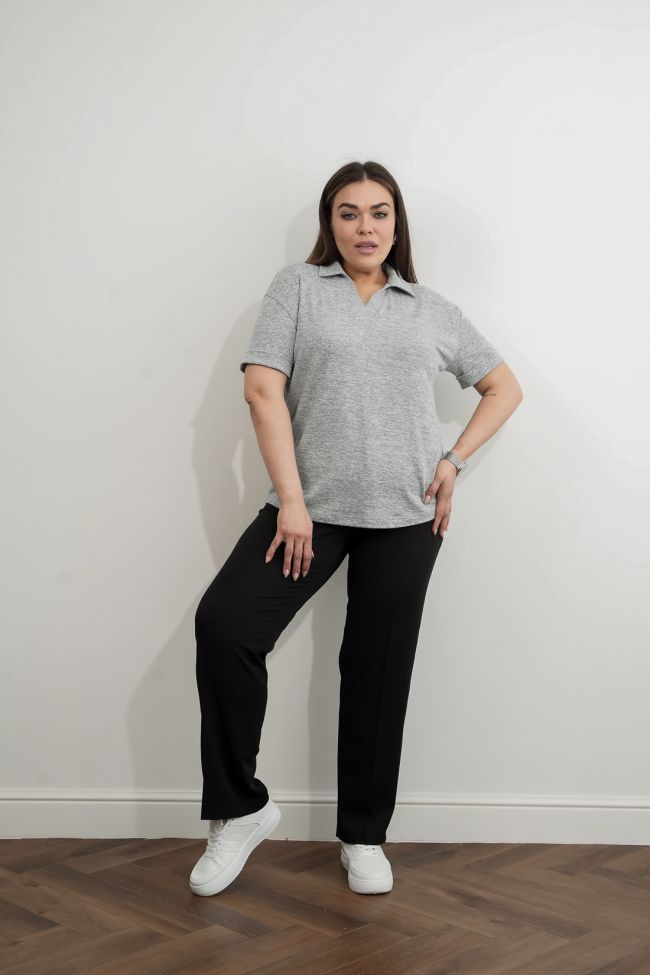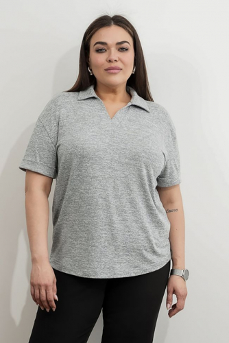 светло-серый Комфортная футболка-поло полуприлегающего силуэта из трикотажа в рубчик. Горловина оформлена удобным V-образным вырезом с воротником типа "Поло" который позволяет создать неповторимый образ. Перед и спинка цельные. Рукава втачные, короткие с манжетой. Футболка поло - это идеальный выбор для тех, кто ценит комфорт и практичность. Легкая и удобная модель станет незаменимым элементом вашего гардероба.