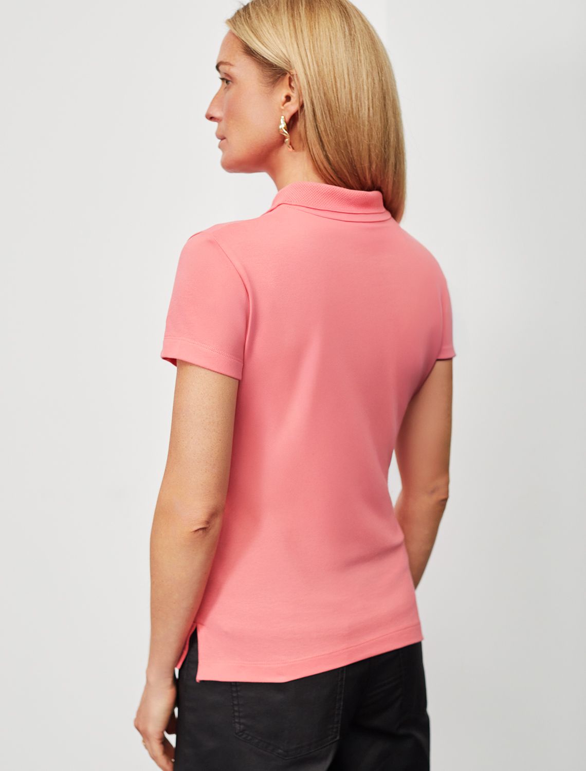 Футболка-поло полуприлегающего силуэта. Классическая модель из хлопка с эластаном с отложным вязаным воротником. Идеально впишется в повседневный гардероб. Застежка на пуговицы на планке.