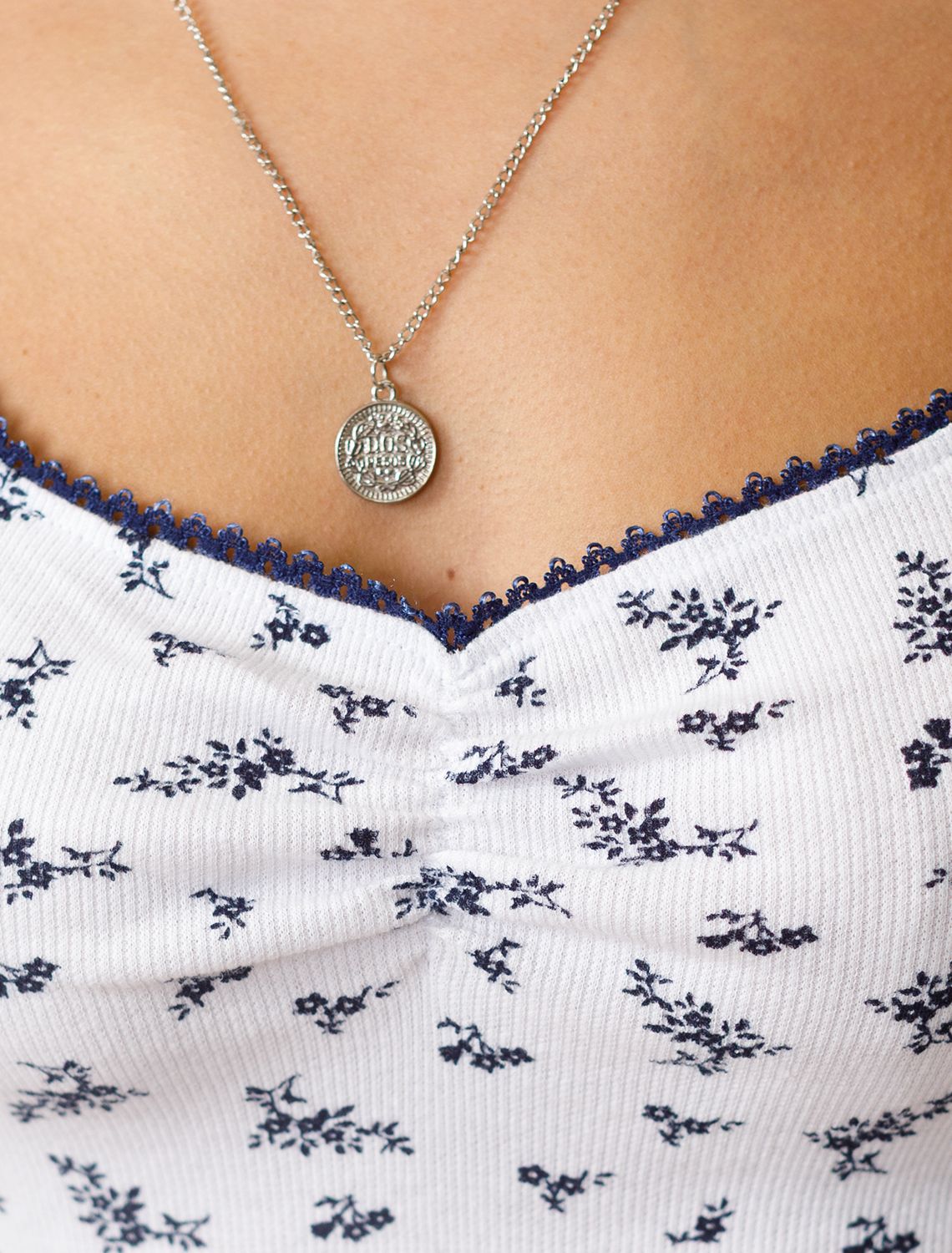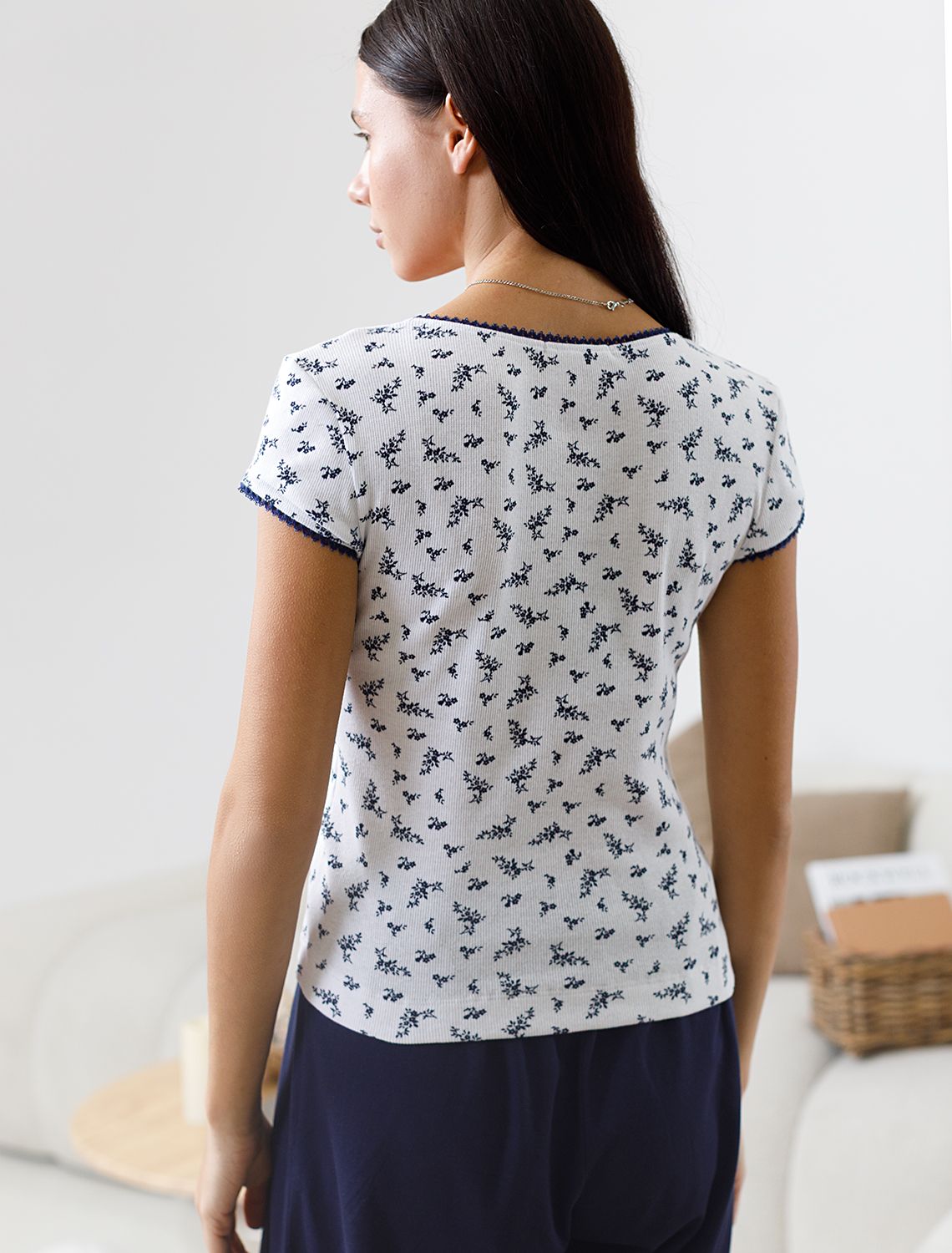 Футболка с фигурным вырезом каре из эластичного трикотажа кашкорсе D49.154 белый-т.синий цветы