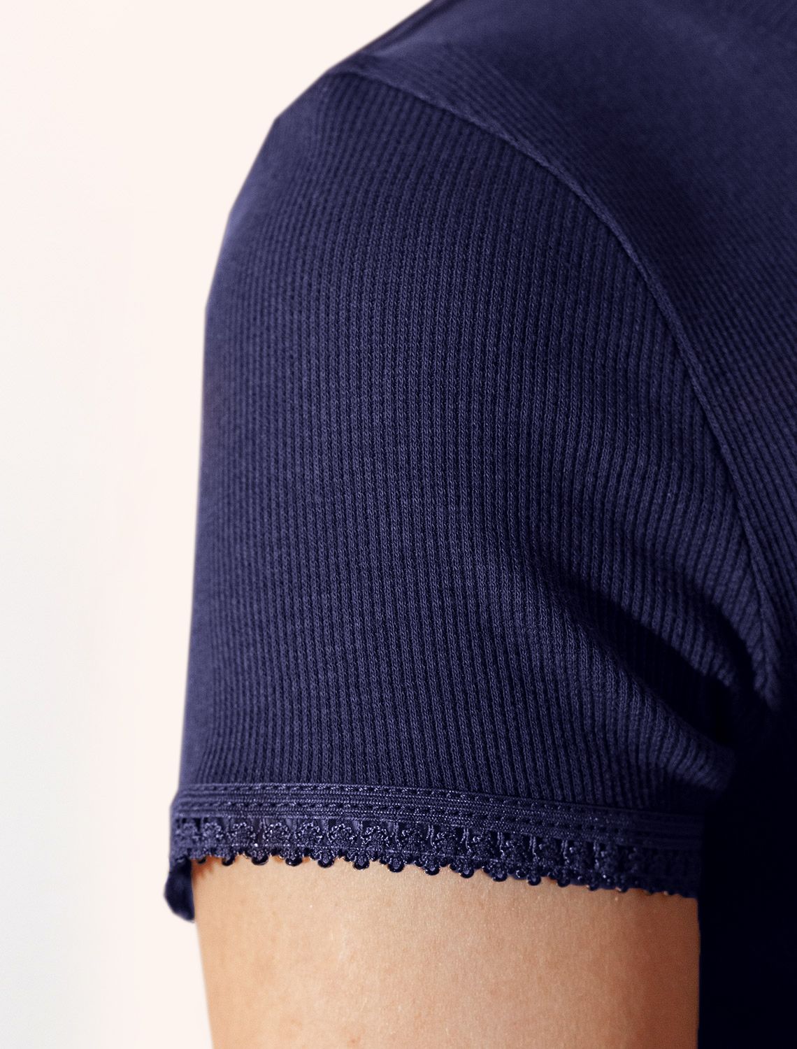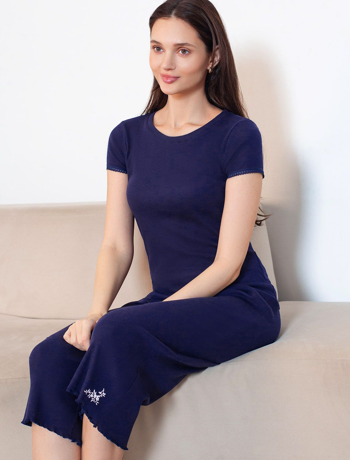 Футболка темно-синего цвета с круглым вырезом из фактурного трикотажа в рубчик идеально сочетается с повседневным стилем и подходит для домашней носки или отдыха. Мягкое полотно из хлопка обеспечивает максимальный комфорт даже в течение длительного времени. Особенность этого изделия — эластичная структура ткани, благодаря чему она хорошо тянется и подстраивается под особенности фигуры. Короткие рукава делают модель легкой и универсальной. На рукавах отделка нежным кружевом в тон основного цвета добавляет нотку романтичности. Футболка подойдет для девушек и женщин, которые ценят уют и удобство. Нежная ткань приятна к телу, не вызывает дискомфорта и позволяет коже дышать, что особенно важно в повседневной жизни. Футболка в мелкий рубчик полуприлегающего кроя визуально вытягивает силуэт и делает фигуру более стройной. Разнообразие размеров позволяет выбрать подходящий вариант для любых параметров, в том числе на большие размеры. Эта красивая футболка практична и незаменима для тех, кто ищет качественные и стильные вещи на каждый день.