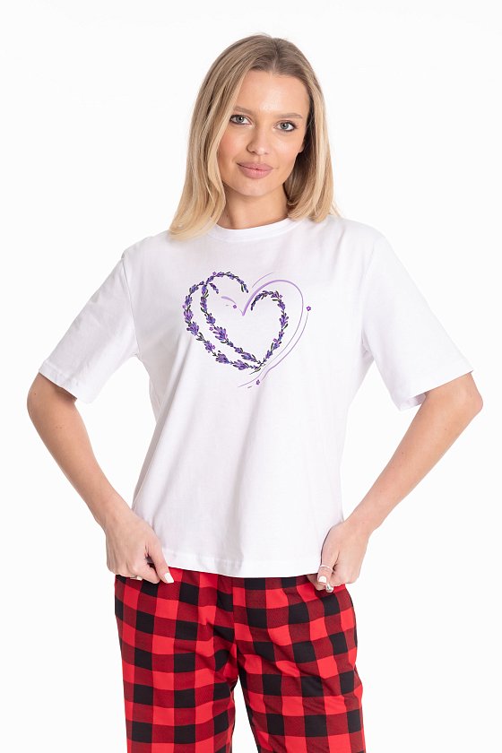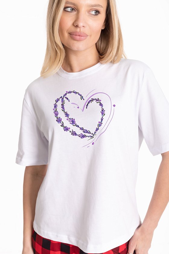 Женская футболка изготовлена из хлопкового полотна, что обеспечивает комфорт и хорошую воздухопроницаемость. Футболка имеет короткий рукав и круглый вырез горловины, что придает ей классический стильный вид. Такая модель базового белого цвета с оригинальным принтом отлично сочетается с джинсами, брюками или юбкой. Изготовленная из натуральной ткани, футболка обеспечит комфорт в течение всего дня.