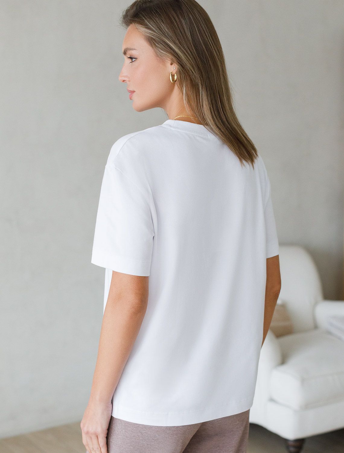 Футболка белого цвета изготовлена из премиального хлопка с эластаном, она обеспечивает невероятное ощущение уюта и легкости. Натуральный материал сохраняет форму и цвет после множества стирок, обеспечивая долговечность изделия, а его высокая воздухопроницаемость создает ощущение свежести даже в течение долгого дня.