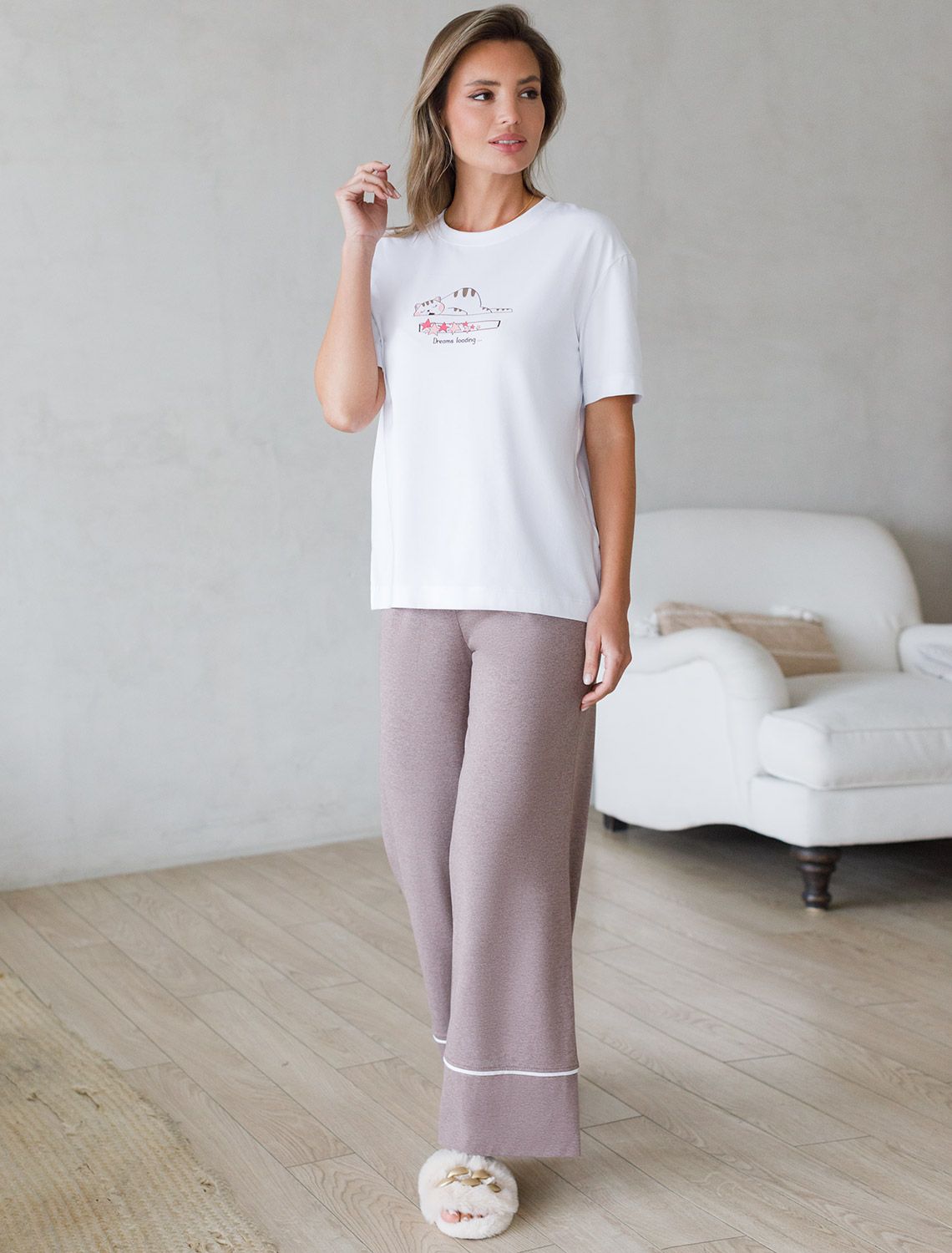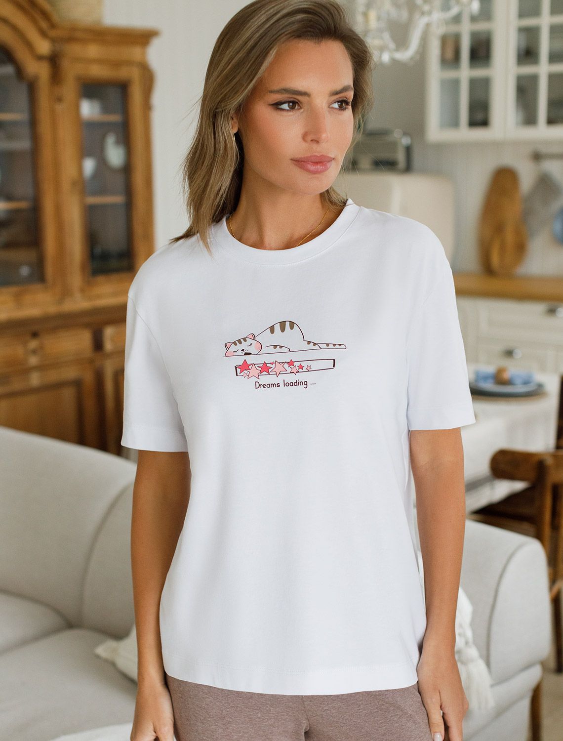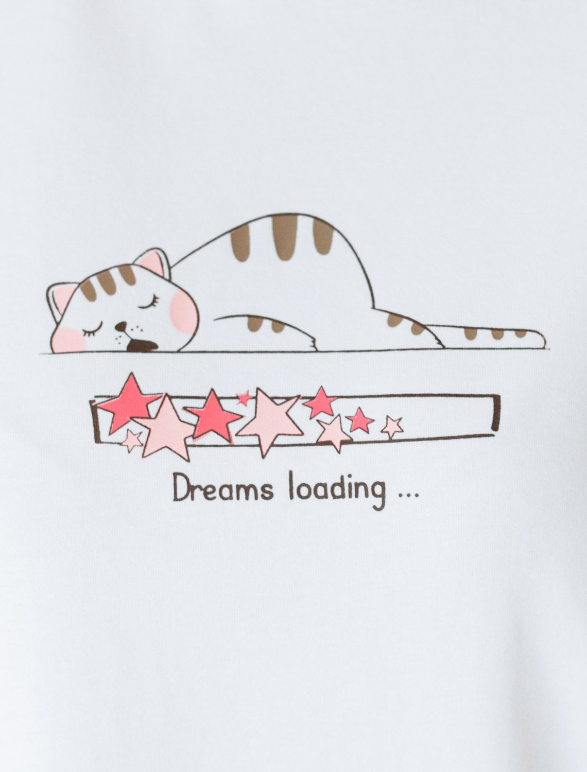 Особое внимание привлекает стильный принт в виде спящего кота с надписью, перевод надписи Dreams loading - Загрузка снов. Принт выполнен красками с устойчивым покрытием, который добавляет изделию оригинальности и позволяет выразить индивидуальность.