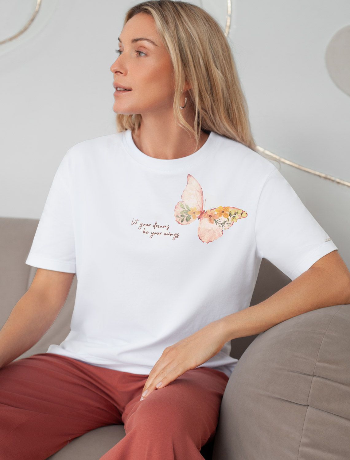 Особое внимание привлекает стильный принт в виде бабочки с минималистичной надписью. Перевод надписи Let your dreams be your wings - Пусть твои мечты станут твоими крыльями. Принт выполнен красками с устойчивым покрытием, который добавляет изделию оригинальности и позволяет выразить индивидуальность.