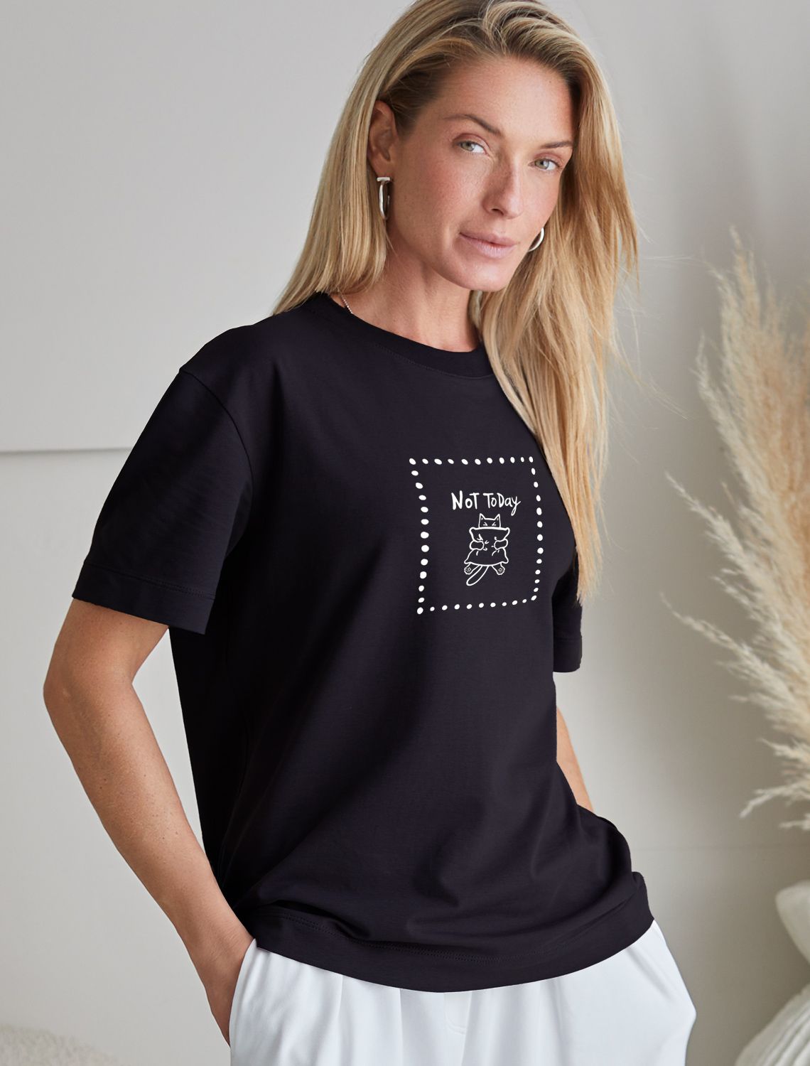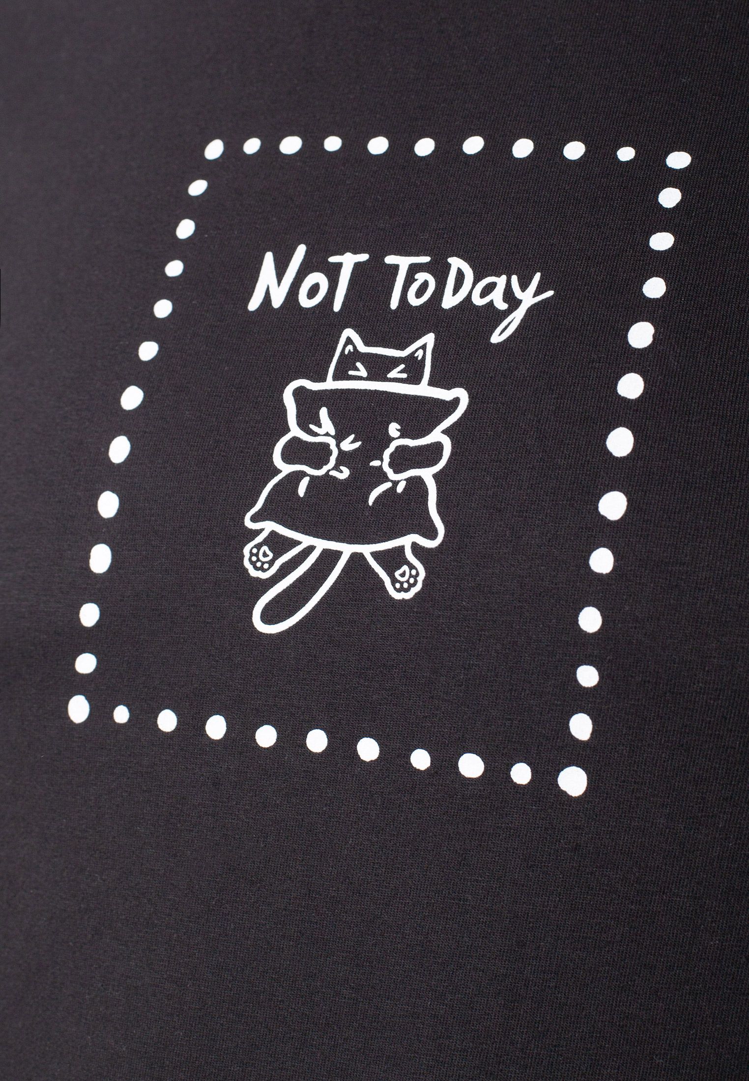 Особое внимание привлекает стильный принт в виде милого котика с минималистичной надписью. Перевод надписи: Not today - Не сегодня. Принт выполнен красками с устойчивым покрытием, который добавляет изделию оригинальности и позволяет выразить индивидуальность.