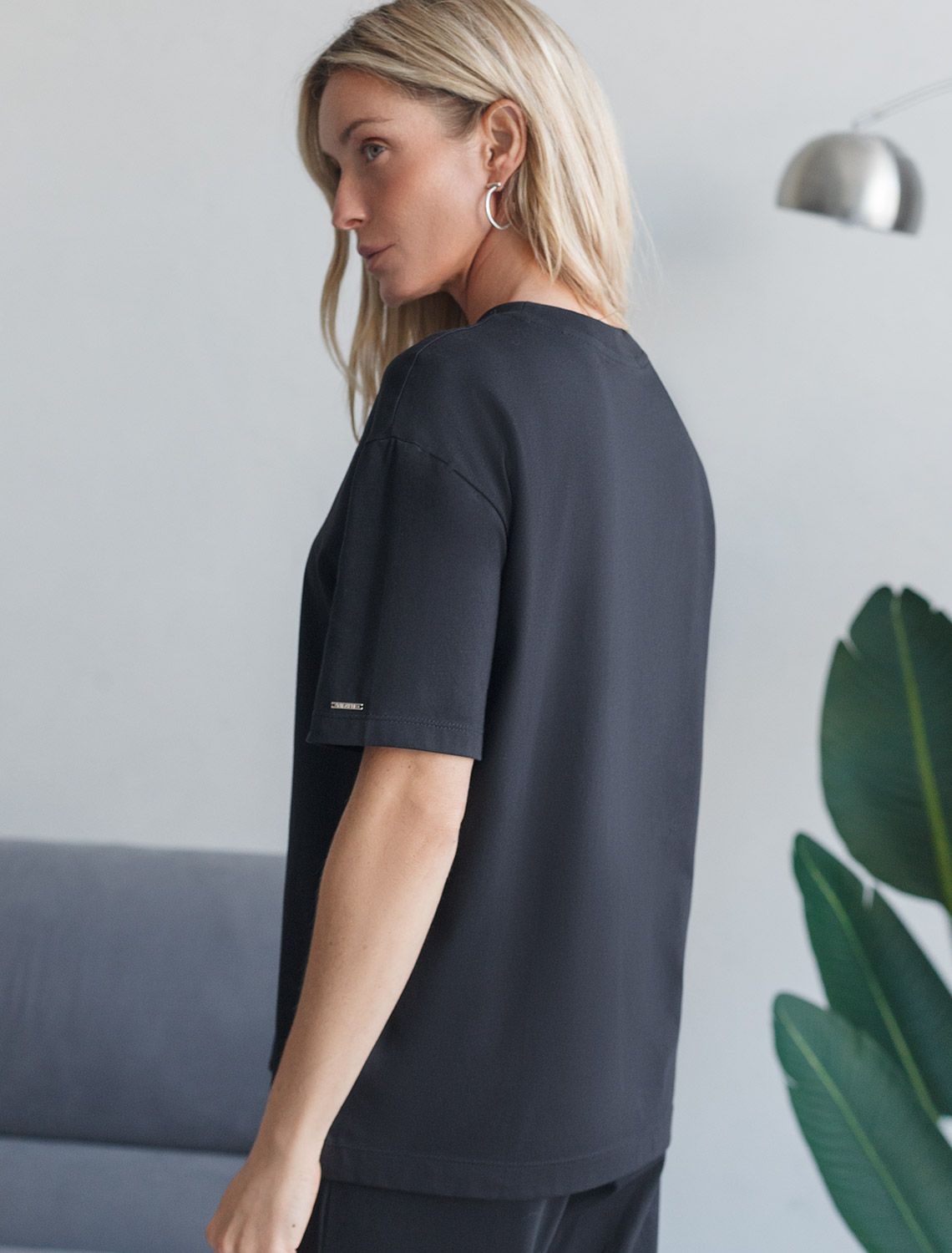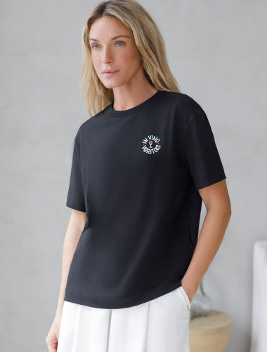 Футболка черного цвета изготовлена из премиального хлопка с эластаном, она обеспечивает невероятное ощущение уюта и легкости. Натуральный материал сохраняет форму и цвет после множества стирок, обеспечивая долговечность изделия, а его высокая воздухопроницаемость создает ощущение свежести даже в течение долгого дня.