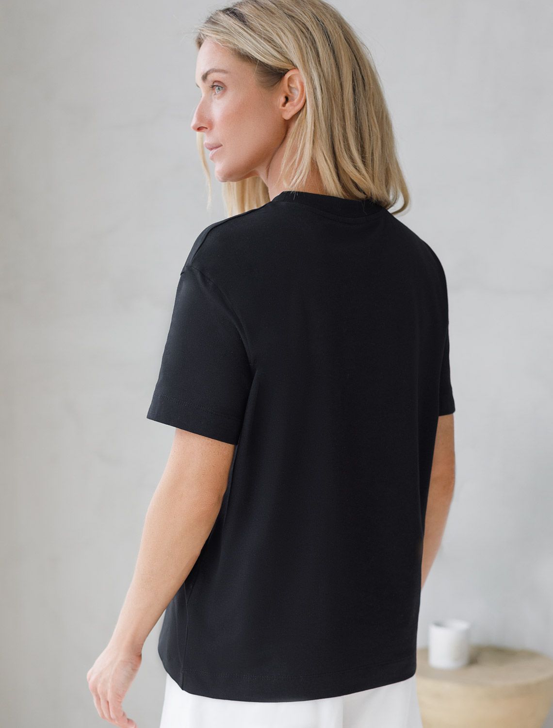 Футболка черного цвета изготовлена из премиального хлопка с эластаном, она обеспечивает невероятное ощущение уюта и легкости. Натуральный материал сохраняет форму и цвет после множества стирок, обеспечивая долговечность изделия, а его высокая воздухопроницаемость создает ощущение свежести даже в течение долгого дня.