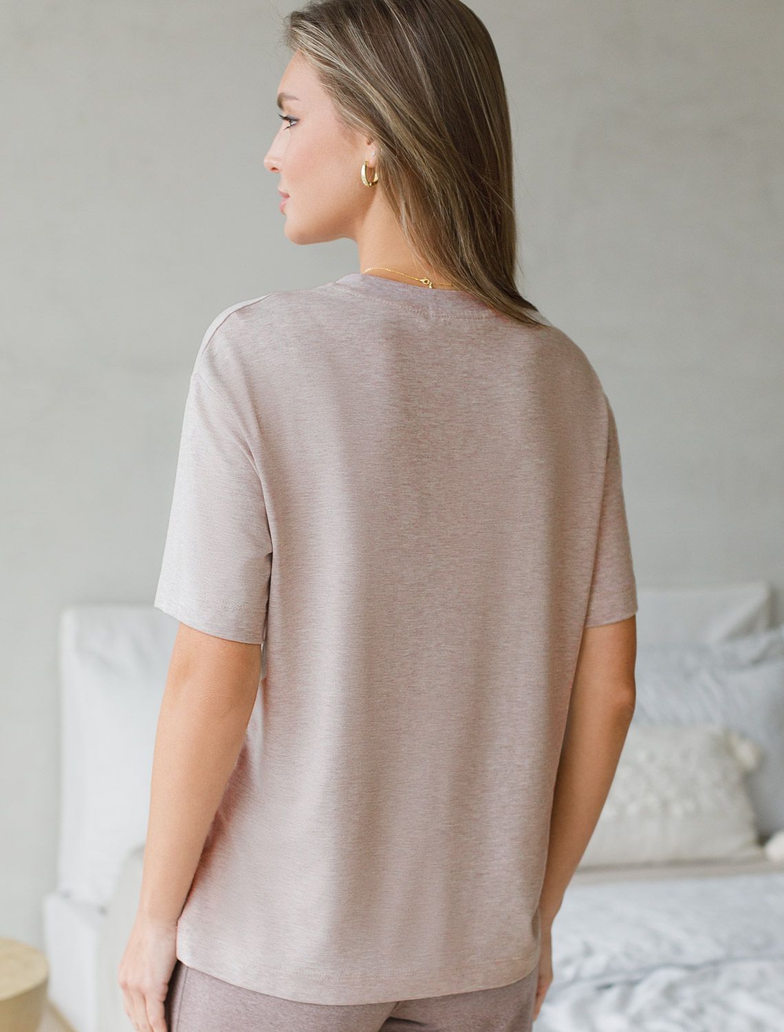 Футболка кофейного цвета изготовлена из премиального хлопка с эластаном, она обеспечивает невероятное ощущение уюта и легкости. Натуральный материал сохраняет форму и цвет после множества стирок, обеспечивая долговечность изделия, а его высокая воздухопроницаемость создает ощущение свежести даже в течение долгого дня.