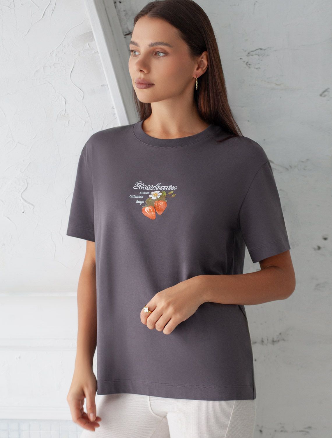 Особое внимание привлекает стильный принт в виде клубники с минималистичной надписью. Перевод надписи: Strawberries sweet summer days - Клубничные сладкие летние дни. Принт выполненны красками с устойчивым покрытием, который добавляет изделию оригинальности и позволяет выразить индивидуальность.
