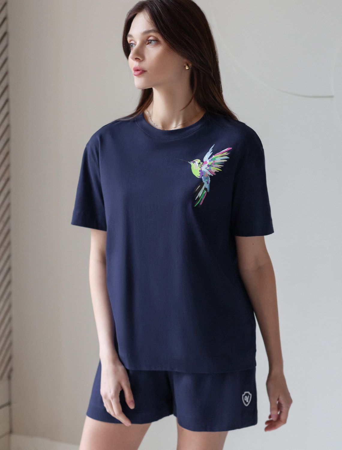 Футболка темно-синего цвета изготовлена из премиального 100% хлопка, благодаря чему изделие приятно прилегает к телу, не вызывает дискомфорта и идеально подходит для чувствительной кожи. Натуральный материал сохраняет форму и цвет после множества стирок, обеспечивая долговечность изделия, а его высокая воздухопроницаемость создает ощущение свежести даже в течение долгого дня. Особое внимание привлекает стильный принт контрастного цвета в виде колибри. Принт выполнен красками с устойчивым покрытием, который добавляет изделию оригинальности и позволяет выразить индивидуальность. Свободный крой футболки дарит удобство и не стесняет движений, что делает ее идеальной для повседневной носки или активного отдыха, подчеркивает современный взгляд на моду. Подойдет девушкам и женщинам на любую фигуру, вы будете чувствовать себя в ней уверенно и комфортно. Лаконичный современный принт делает изделие универсальным: можно создавать стильные образы для прогулок, встреч, занятий спортом и домашних дел. Базовая футболка подходит для любой ситуации и сочетается с разными элементами гардероба.