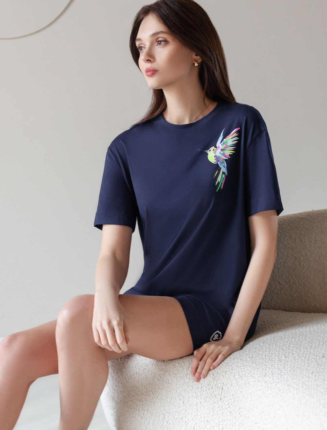 Футболка с принтом свободная из премиального 100% хлопка D49.158 т.синий_колибри