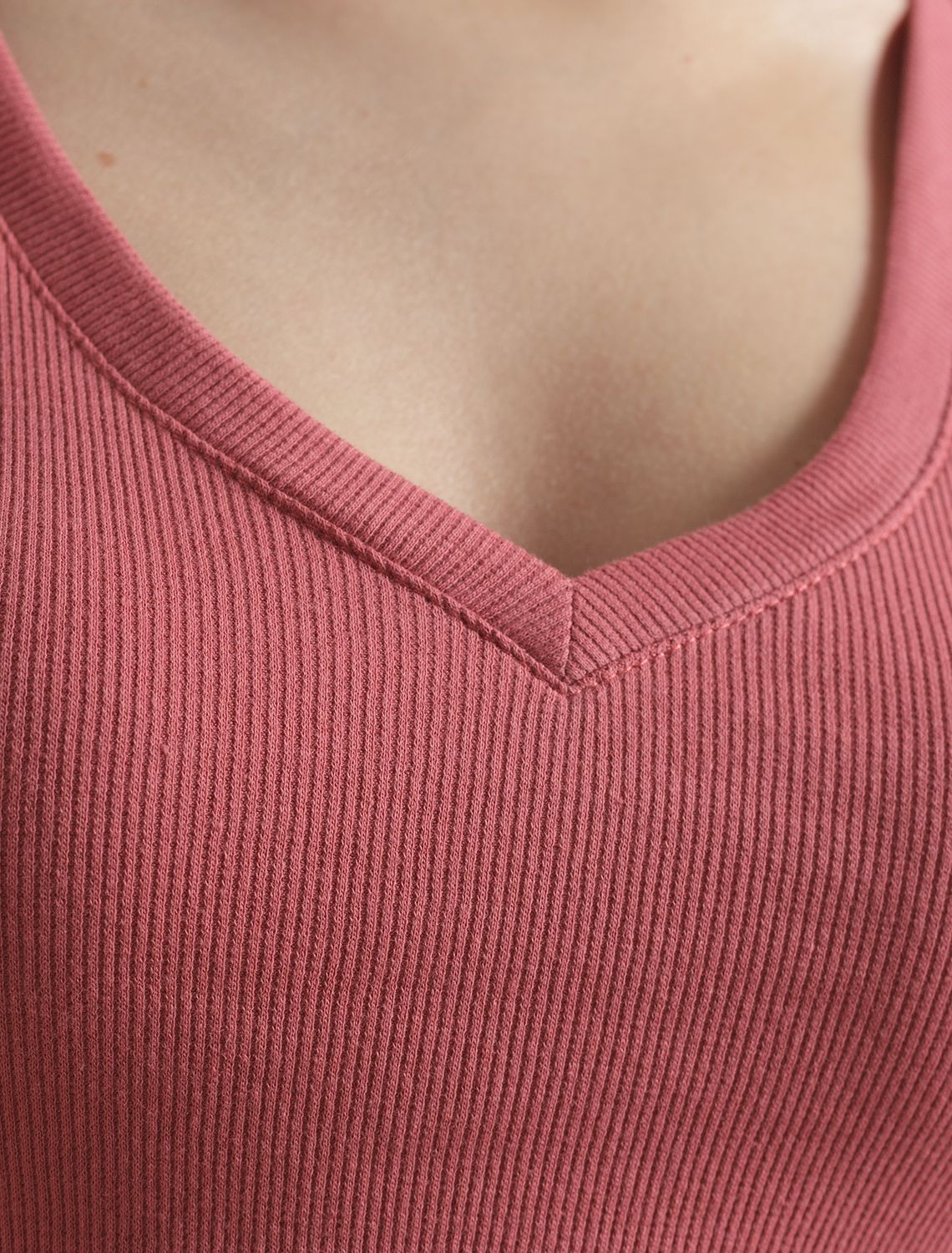 Футболка темно-кораллового цвета с V вырезом из фактурного трикотажа в рубчик. Особенность полотна - трикотаж кашкорсе удивительной мягкости, намного мягче стандартных вариантов, подходящий для расслабленных домашних и пижамных образов. Хлопок обеспечивает максимальный комфорт даже в течение длительного времени и позволяет коже дышать, а эластан в составе позволяет ткани подстраиваться под особенности фигуры. Короткие рукава делают модель легкой и универсальной. V-образный вырез красиво подчеркивает зону декольте, придавая образу утонченность и женственность, не открывая лишнего, сохраняя при этом комфорт и уверенность в себе. Футболка подойдет для девушек и женщин, которые ценят уют и удобство. Футболка в мелкий рубчик полуприлегающего кроя визуально вытягивает силуэт и делает фигуру более стройной. Разнообразие размеров позволяет выбрать подходящий вариант для любых параметров, в том числе на большие размеры. Эта красивая футболка практична и незаменима для тех, кто ищет качественные и стильные вещи на каждый день.