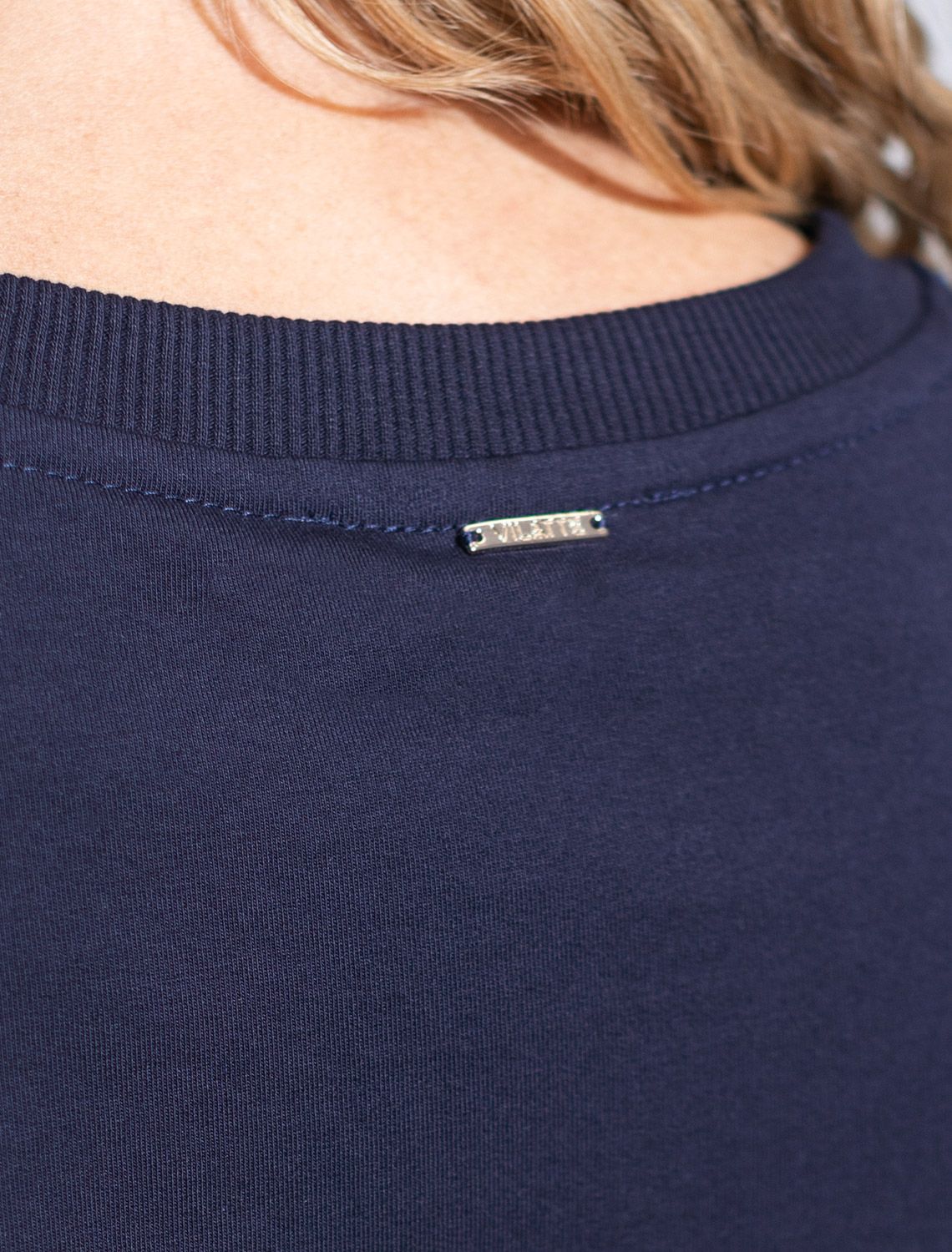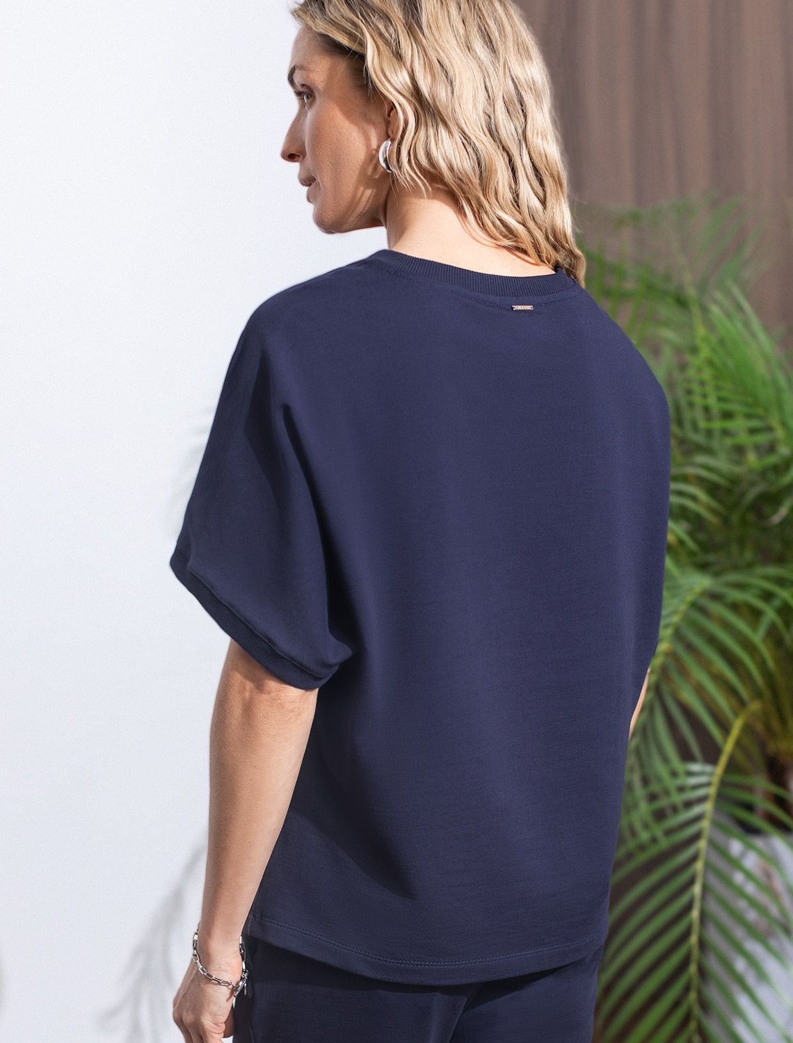 Футболка темно-синего цвета свободного кроя выполнена из премиального футера двухнитки с эластаном плотностью 240 Г/м2. . Натуральный материал отличается мягкостью и приятной текстурой, позволяя коже дышать и обеспечивая максимальное удобство при носке. Наличие эластана в составе изделия гарантирует абсолютный комфорт и формоустойчивость. Круглый ворот, рукава регланы средней длины и спущенная линия плеча придают футболке стильный и современный вид, делают образ расслабленным и непринужденным, такой вариант отлично сядет на большие размеры. Плотная футболка идеально подходит для повседневной носки и незаменима для тех, кто ценит удобство и свободу движений без компромиссов по стилю.