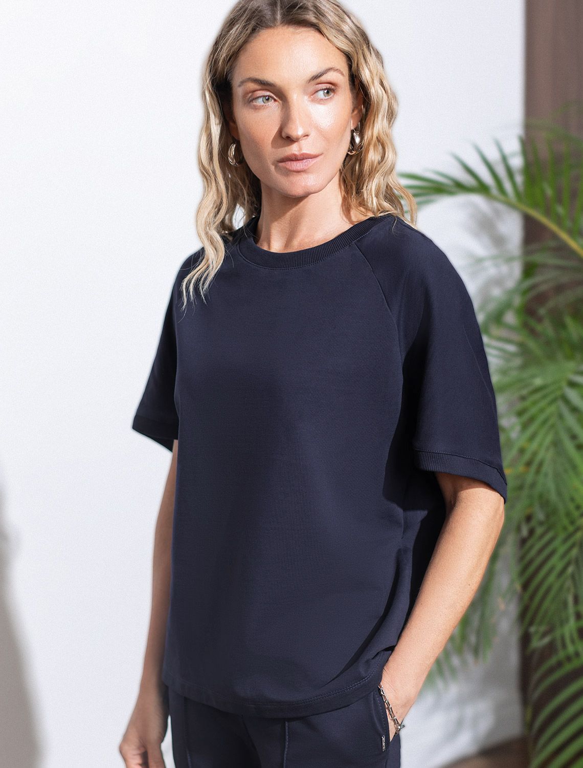 95%Хлопок 5%ПУ Футболка темно-синего цвета свободного кроя выполнена из премиального футера двухнитки с эластаном плотностью 240 Г/м2. . Натуральный материал отличается мягкостью и приятной текстурой, позволяя коже дышать и обеспечивая максимальное удобство при носке. Наличие эластана в составе изделия гарантирует абсолютный комфорт и формоустойчивость. Круглый ворот, рукава регланы средней длины и спущенная линия плеча придают футболке стильный и современный вид, делают образ расслабленным и непринужденным, такой вариант отлично сядет на большие размеры. Плотная футболка идеально подходит для повседневной носки и незаменима для тех, кто ценит удобство и свободу движений без компромиссов по стилю.