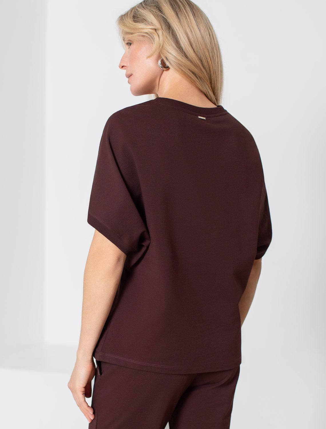 Футболка коричневого цвета свободного кроя выполнена из премиального футера двухнитки с эластаном плотностью 240 Г/м2. . Натуральный материал отличается мягкостью и приятной текстурой, позволяя коже дышать и обеспечивая максимальное удобство при носке. Наличие эластана в составе изделия гарантирует абсолютный комфорт и формоустойчивость. Круглый ворот, рукава регланы средней длины и спущенная линия плеча придают футболке стильный и современный вид, делают образ расслабленным и непринужденным, такой вариант отлично сядет на большие размеры. Плотная футболка идеально подходит для повседневной носки и незаменима для тех, кто ценит удобство и свободу движений без компромиссов по стилю.