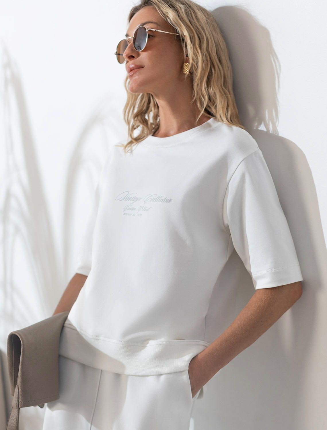 Футболка белого цвета свободного кроя выполнена из премиального футера двухнитки с эластаном плотностью 240 Г/м2. . Натуральный материал отличается мягкостью и приятной текстурой, позволяя коже дышать и обеспечивая максимальное удобство при носке. Наличие эластана в составе изделия гарантирует абсолютный комфорт и формоустойчивость. Круглый ворот, рукава средней длины и спущенная линия плеча придают футболке стильный и современный вид, делают образ расслабленным и непринужденным, такой вариант отлично сядет на большие размеры. Футболку украшает принт виде надписи. Перевод надписи: Vintage collection - Витнажная коллекция. Плотная футболка идеально подходит для повседневной носки и незаменима для тех, кто ценит удобство и свободу движений без компромиссов по стилю.