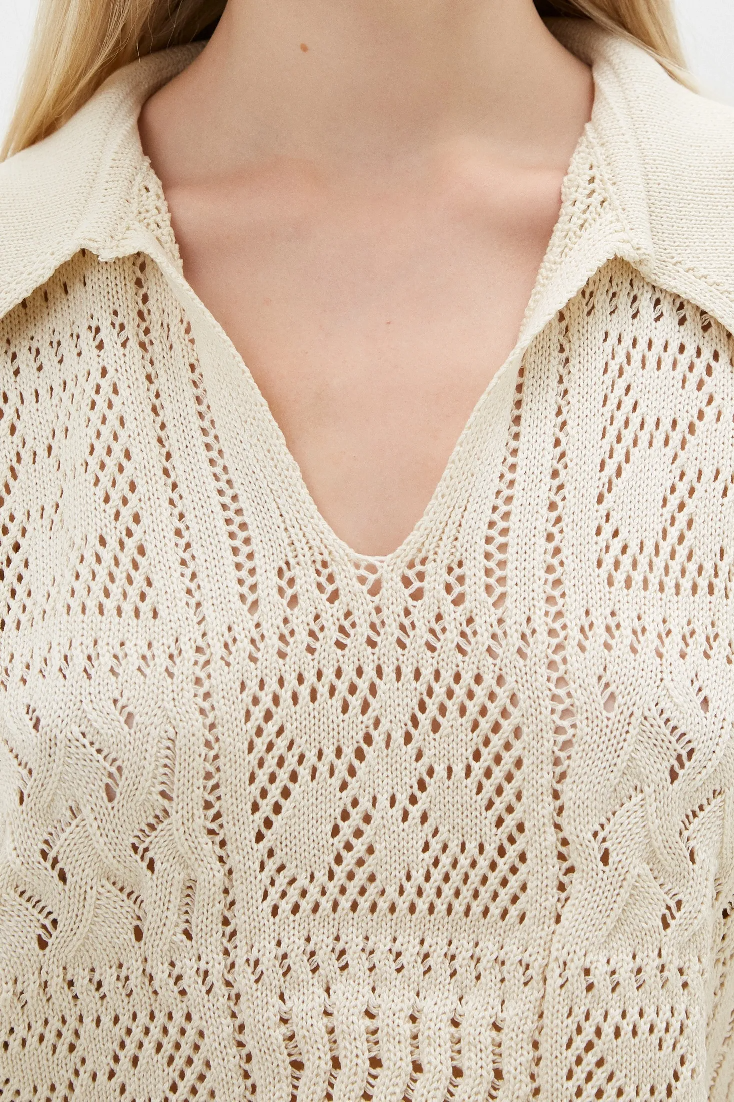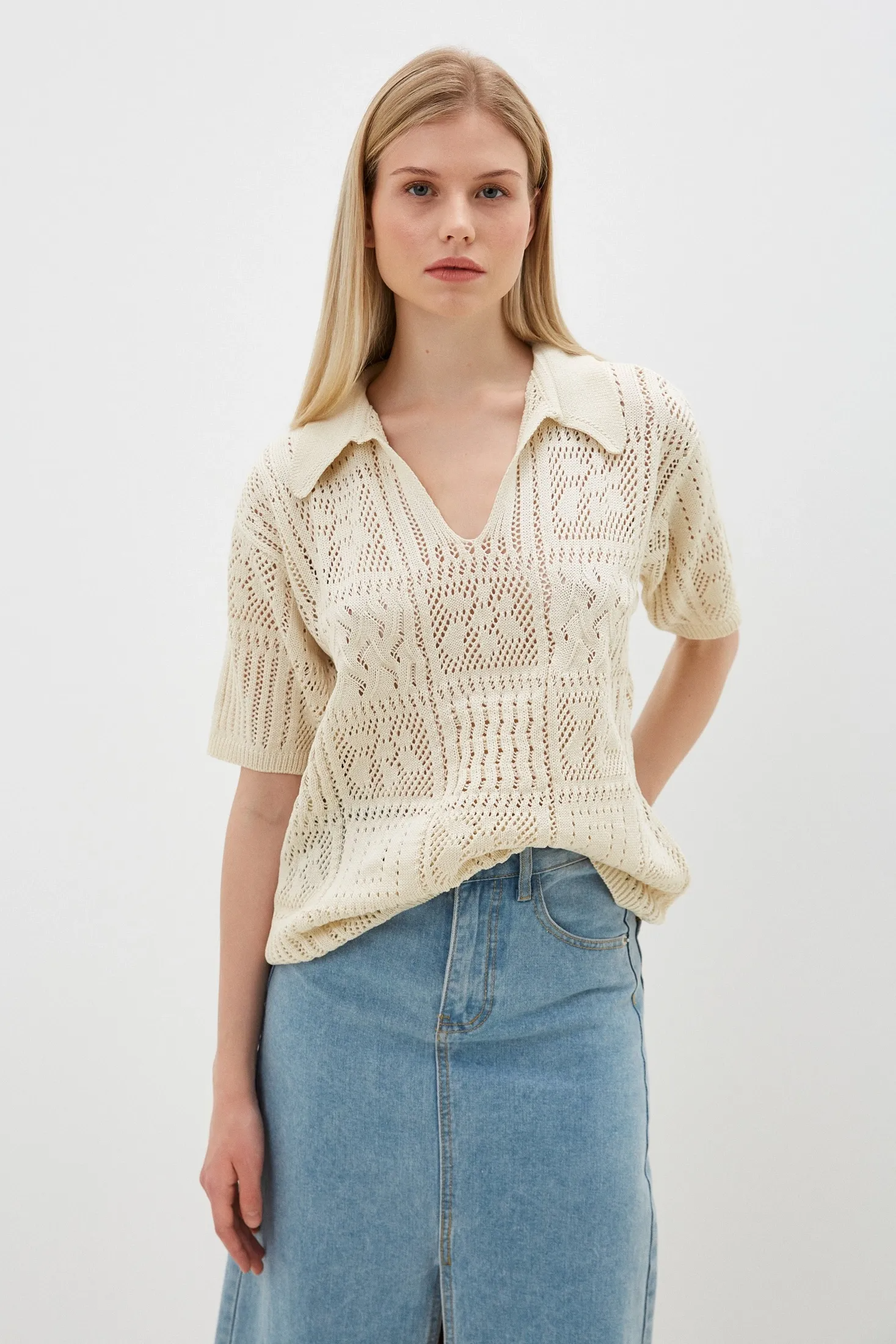 Модная и элегантная футболка Мариана выполнена в ажурной вязке. Отложной воротничек, рукав три четверти и удобная длина – все позволит почувствовать себя комфортно. Невероятно мягкий и легкий материал. Футболка преобразит Ваш повседневный образ и станет незаменимой вещью базового гардероба. Уникальный орнамент с выраженными ажурными линиями и узорами понравится Вам и окружающим.
