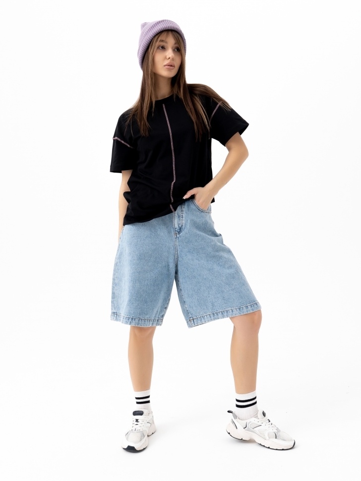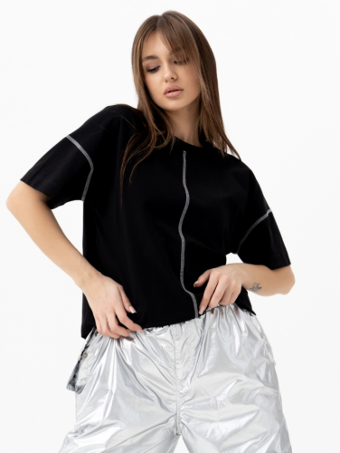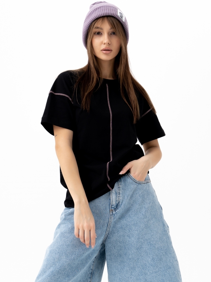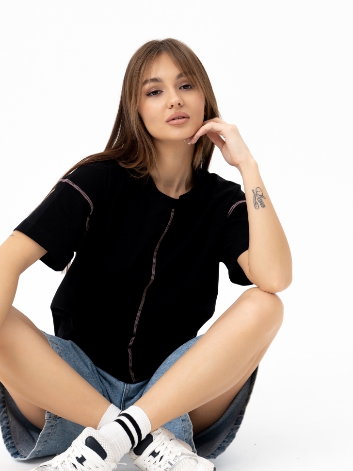 Женская футболка полуприлегающего силуэта с короткими рукавами. Контрастная отделочная строчка подчеркивает модную деталь сезона - спущенную линию плеча. Стильная футболка из хлопка с минимальным добавлением лайкры, что позволяет ей не деформироваться в процессе стирки и носки, займет достойное место в летнем гардеробе каждой девушки. Классическая длина до середины бедра, круглая горловина и свободные короткие рукава - залог успеха этой модели в любой обстановке. Футболка великолепно комбинируется и с юбками, и с брюками. При этом превращает любую фигуру в идеальную, благодаря вертикальной линии строчки по центру полочки. Способность трикотажа хорошо пропускать воздух и отводить влагу делает футболку в стиле спорт - шик удобной и приятной к телу. Трикотажное полотно Турецкого производства не потеряет яркость цвета даже после множества стирок. Рост модели на фото 170 см. Параметры модели: 80-61-87. Размер изделия на модели: 46. Материал: кулирка с лайкрой (хлопок 95%, лайкра 5%).