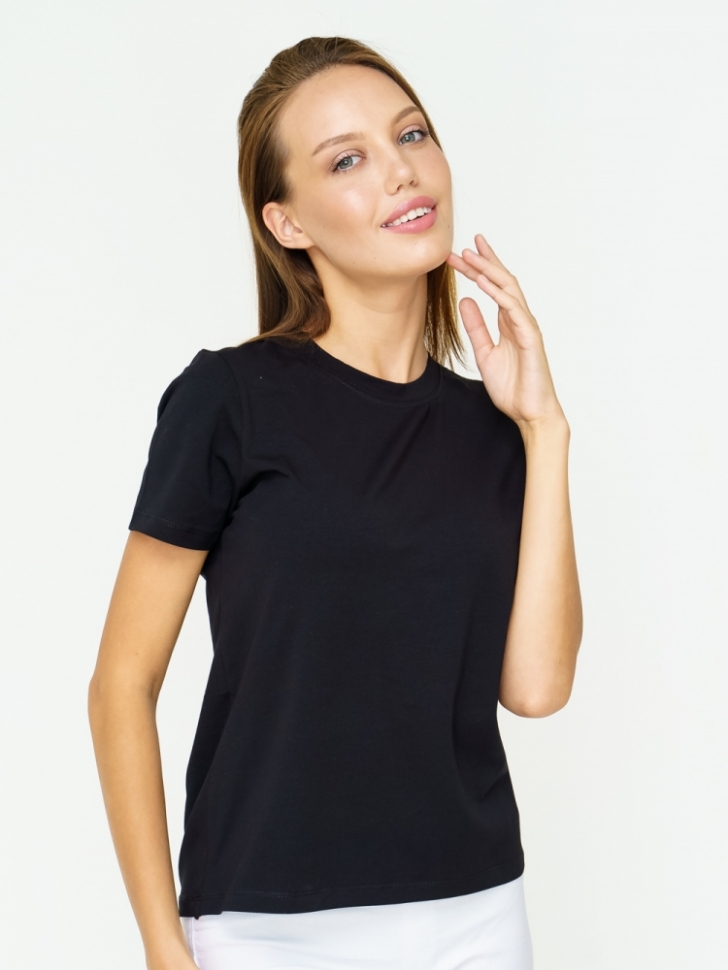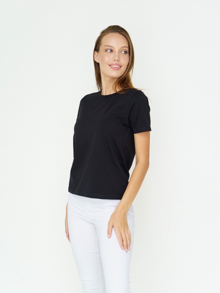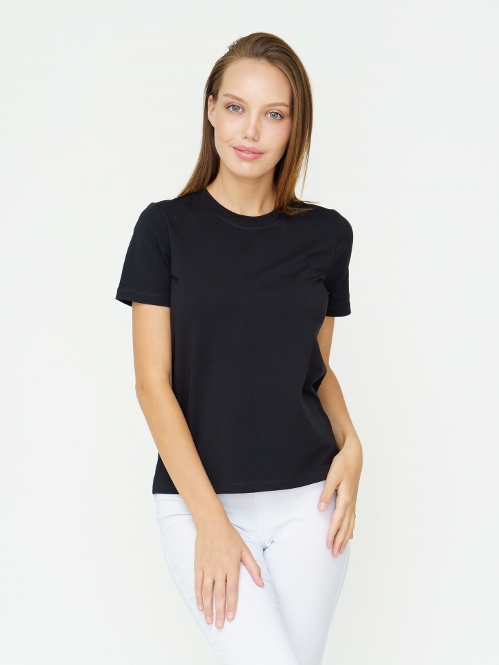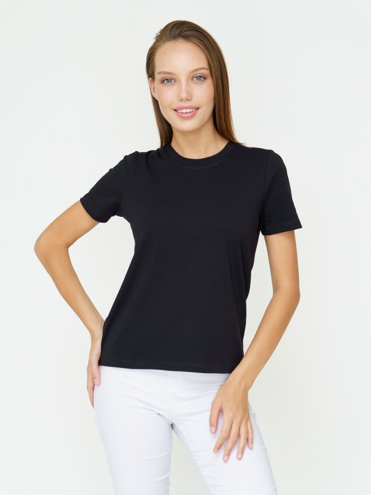 Базовая футболка прямого силуэта с втачными короткими рукавами. Круглая горловина обработана широкой обтачкой. Способность хлопчатобумажного трикотажа хорошо пропускать воздух и отводить влагу делает футболку комфортной в носке и приятной к телу. Лайкра в составе изделия придает полотну эластичность и несминаемость, а сама ткань на ощупь мягкая и гладкая. Длина модели до середины бедра позволяет легко заправить её в брюки или юбку полностью. Если вы счастливая обладательница талии, сделайте акцент на ней и заправьте только полочку футболки за пояс юбки. Такой прием не только корректирует силуэт, но и очень даже в тренде. Рост модели на фото 175 см. Параметры модели: 84-60-92. Размер изделия на модели: 44. Материал: кулирка с лайкрой (хлопок 95%, лайкра 5%).