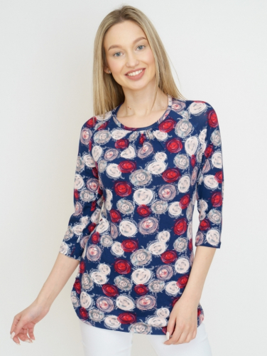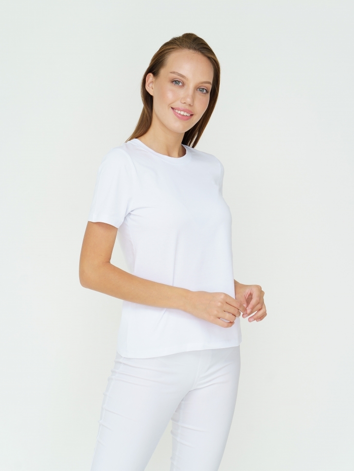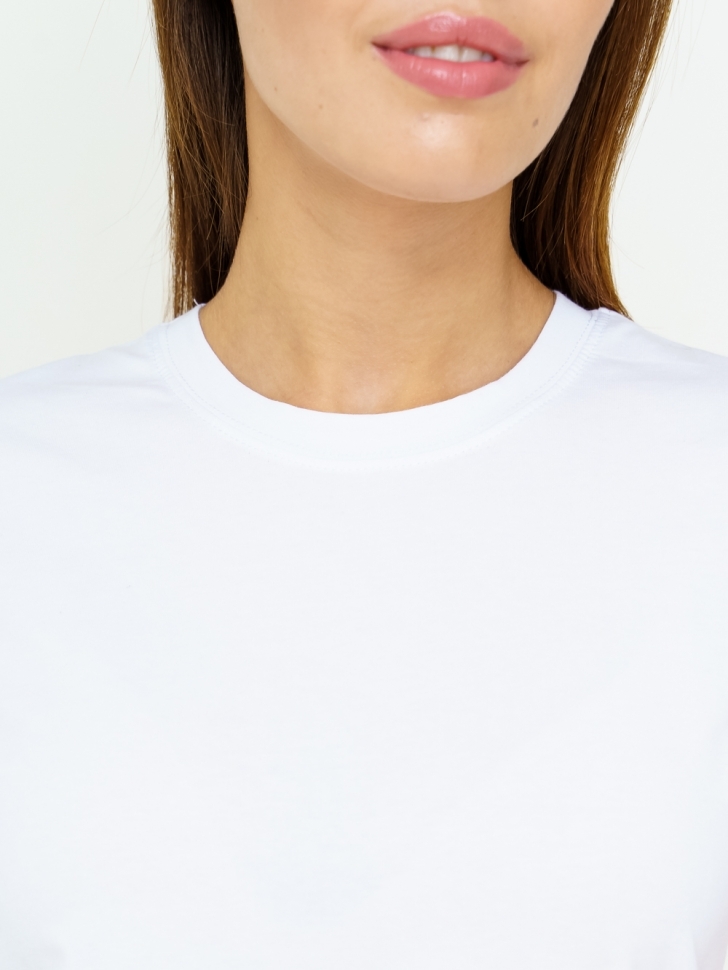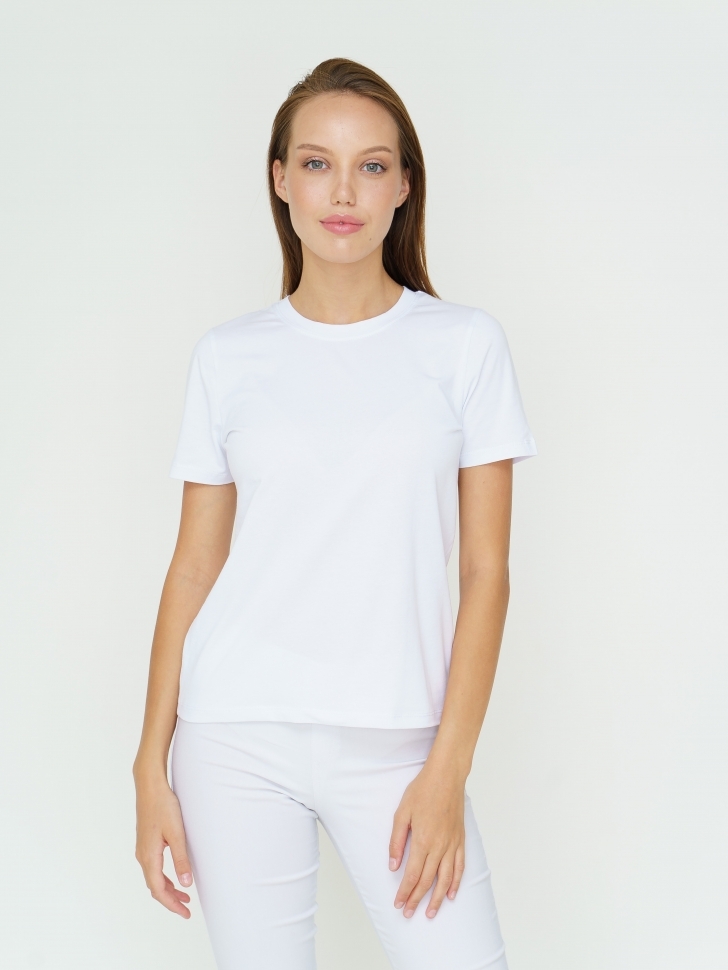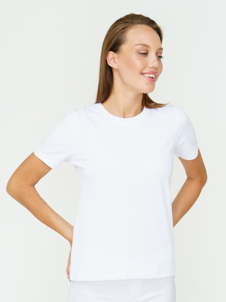 Базовая футболка прямого силуэта с втачными короткими рукавами. Круглая горловина обработана широкой обтачкой. Способность хлопчатобумажного трикотажа хорошо пропускать воздух и отводить влагу делает футболку комфортной в носке и приятной к телу. Лайкра в составе изделия придает полотну эластичность и несминаемость, а сама ткань на ощупь мягкая и гладкая. Длина модели до середины бедра позволяет легко заправить её в брюки или юбку полностью. Если вы счастливая обладательница талии, сделайте акцент на ней и заправьте только полочку футболки за пояс юбки. Такой прием не только корректирует силуэт, но и очень даже в тренде. Рост модели на фото 175 см. Параметры модели: 84-60-92. Размер изделия на модели: 44. Материал: кулирка с лайкрой (хлопок 95%, лайкра 5%).
