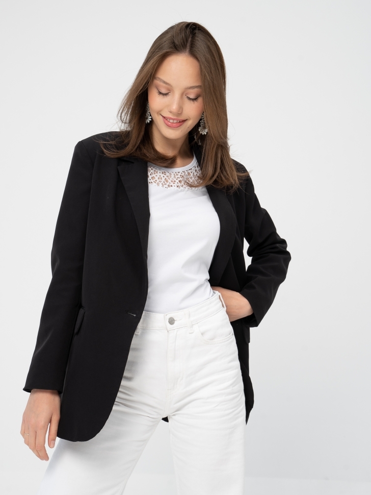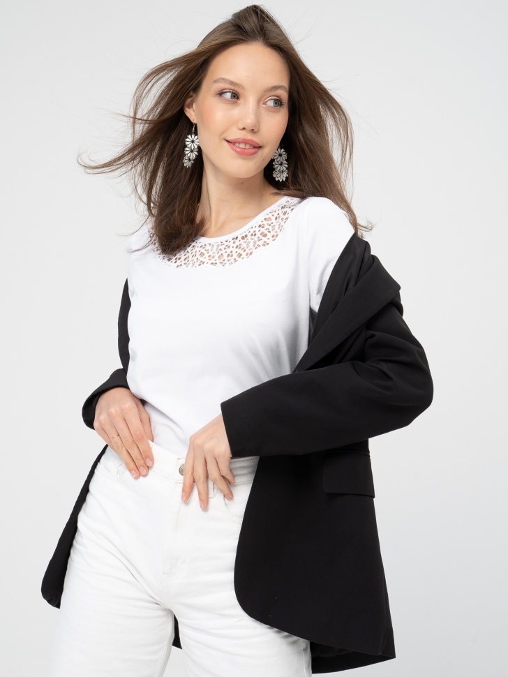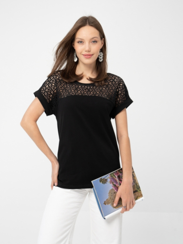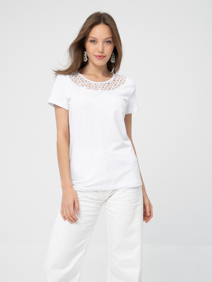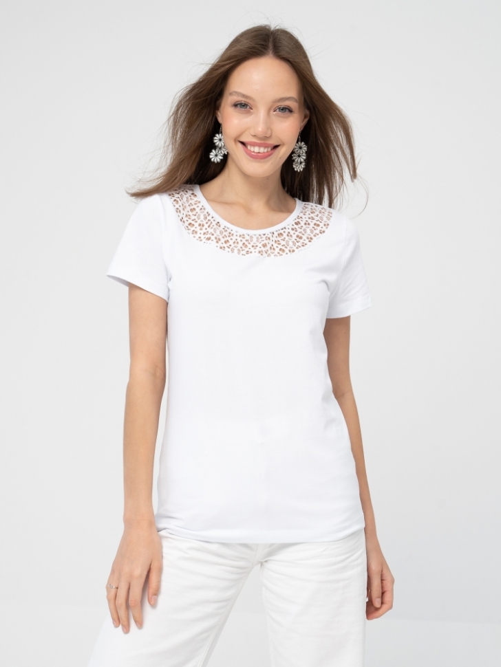 Футболка прямого силуэта длиной ниже линии бедер в романтическом стиле. Широкая круглая кокетка на полочке из кружева.Короткие рукава базового кроя. Комплектуйте футболку с узкими брюками, юбками фасона «карандаш», с актуальными брюками - трубами из мягкой ткани. Вышитое кружево в технике ришелье, точно совпадающее с тоном основы, сделает образ изысканно-утонченным. Носить такую футболку могут как леди молодого возраста, так и дамы, перешагнувшие порог 50 лет. Плечевые и грудные вытачки перенесены в соединительные швы кокетки, благодаря чему модель любого размера, начиная с 46 и заканчивая 60-м, идеально «садится» по фигуре. Рост модели на фото 175 см. Параметры модели: 84-60-92. Размер изделия на модели: 46. Размер – Длина изделия по спинке (см): 46 – 61 48 – 61,5 50 – 62 52 – 62,5 54 – 63 56 – 63,5 58 – 64 60 – 64,5 Материал: кулирка (хлопок 95%, лайкра 5%).