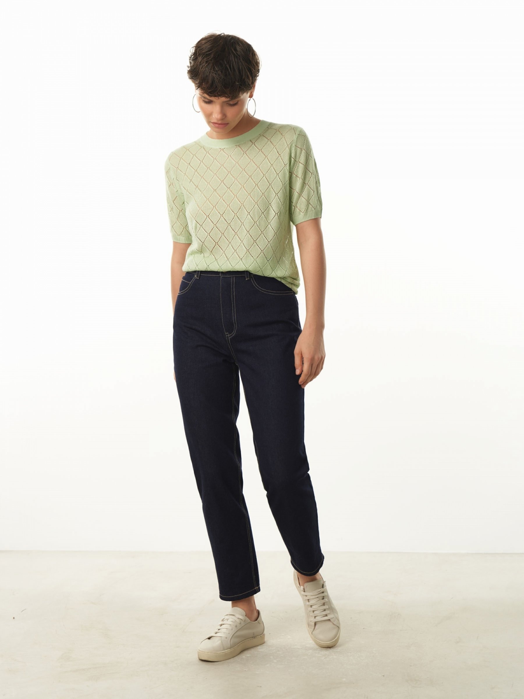 Как представить весенний гардероб без воздушно-ажурного джемпера? Модель имеет полуприлегающий крой и прямые короткие рукава. Круглая горловина, манжеты и низ декорированы фактурной резинкой в тон. Джемпер выполнен из качественной пряжи на основе вискозы. Три базовых цвета: молочный, мятный и черный. 99% вискоза, 1% нейлон