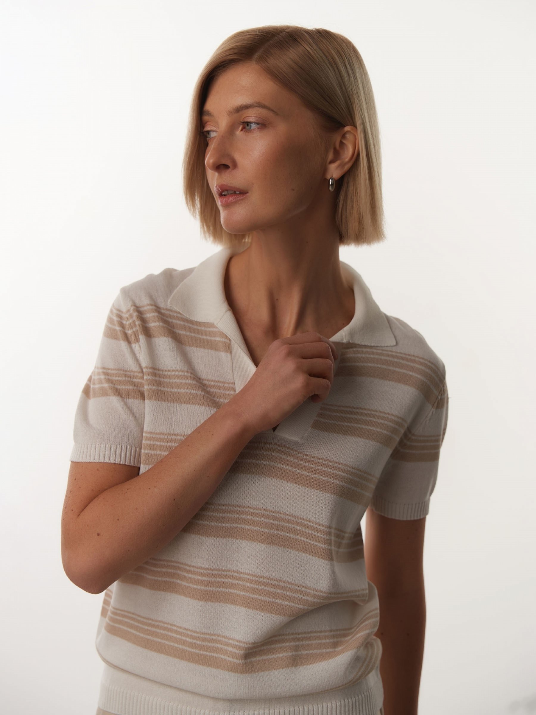 Классический джемпер полуприлегающего кроя с контрастными горизонтальными полосами – элегантный и универсальный. То, что нужно для жарких дней и комфортного самочувствия. Материал – легкий мягкий трикотаж гладкой вязки на основе вискозы. V-образный вырез с отложным воротником, манжеты, и низ оформлены фактурной резинкой. Выбирайте цвет под лук и настроение: молочно-коралловый, молочно-бежевый, молочно-серый. 89% вискоза, 11% нейлон